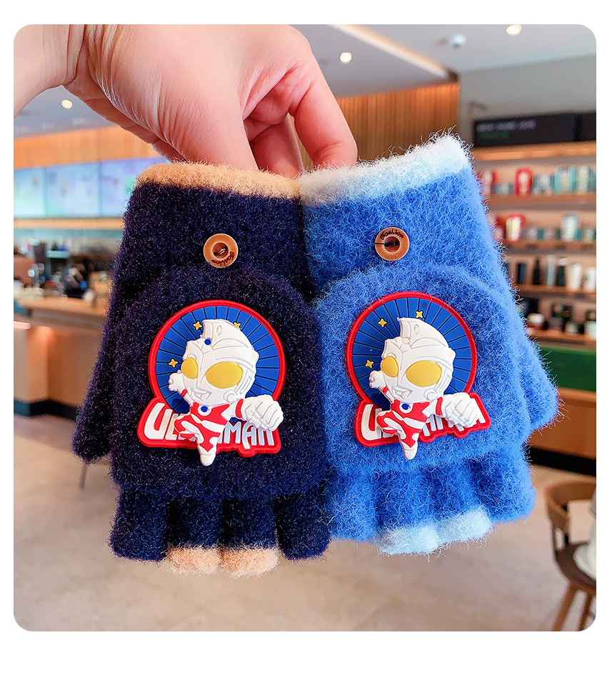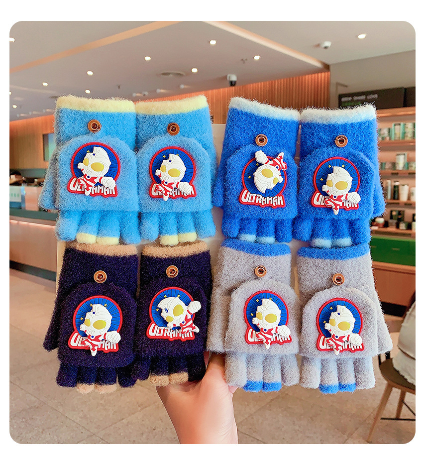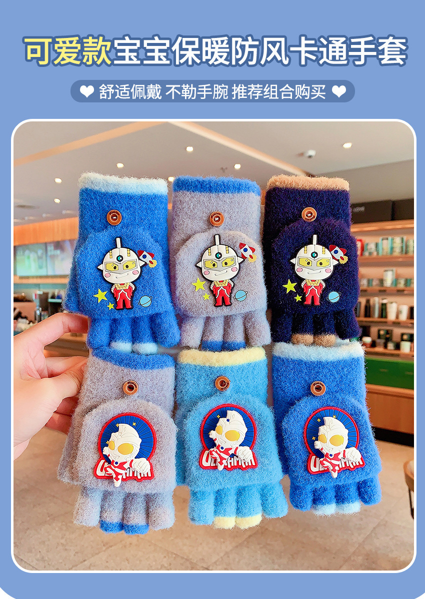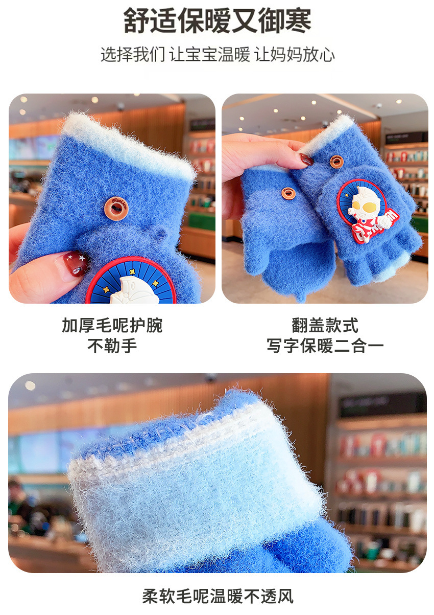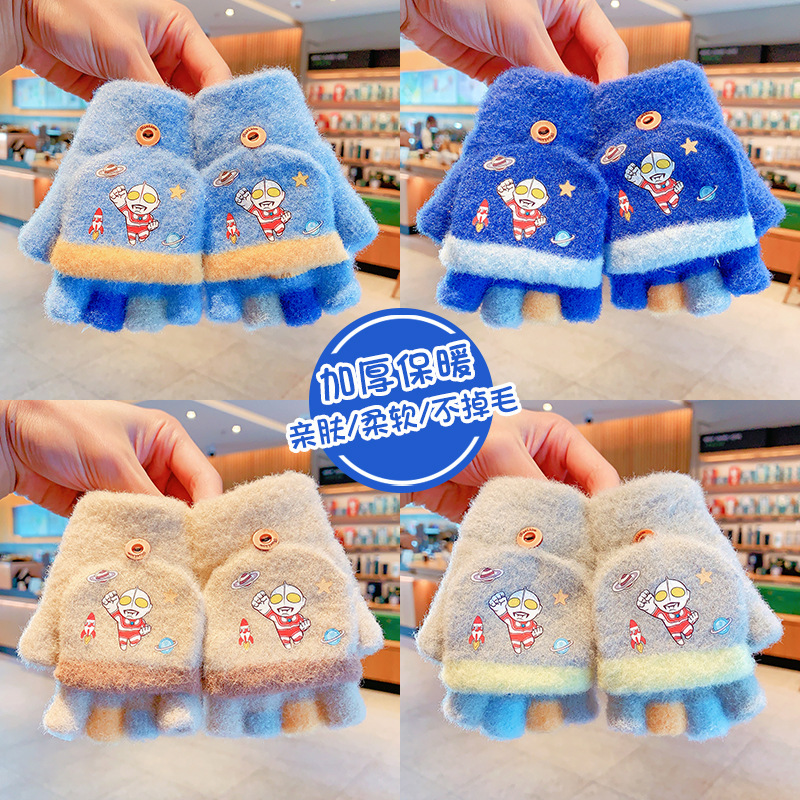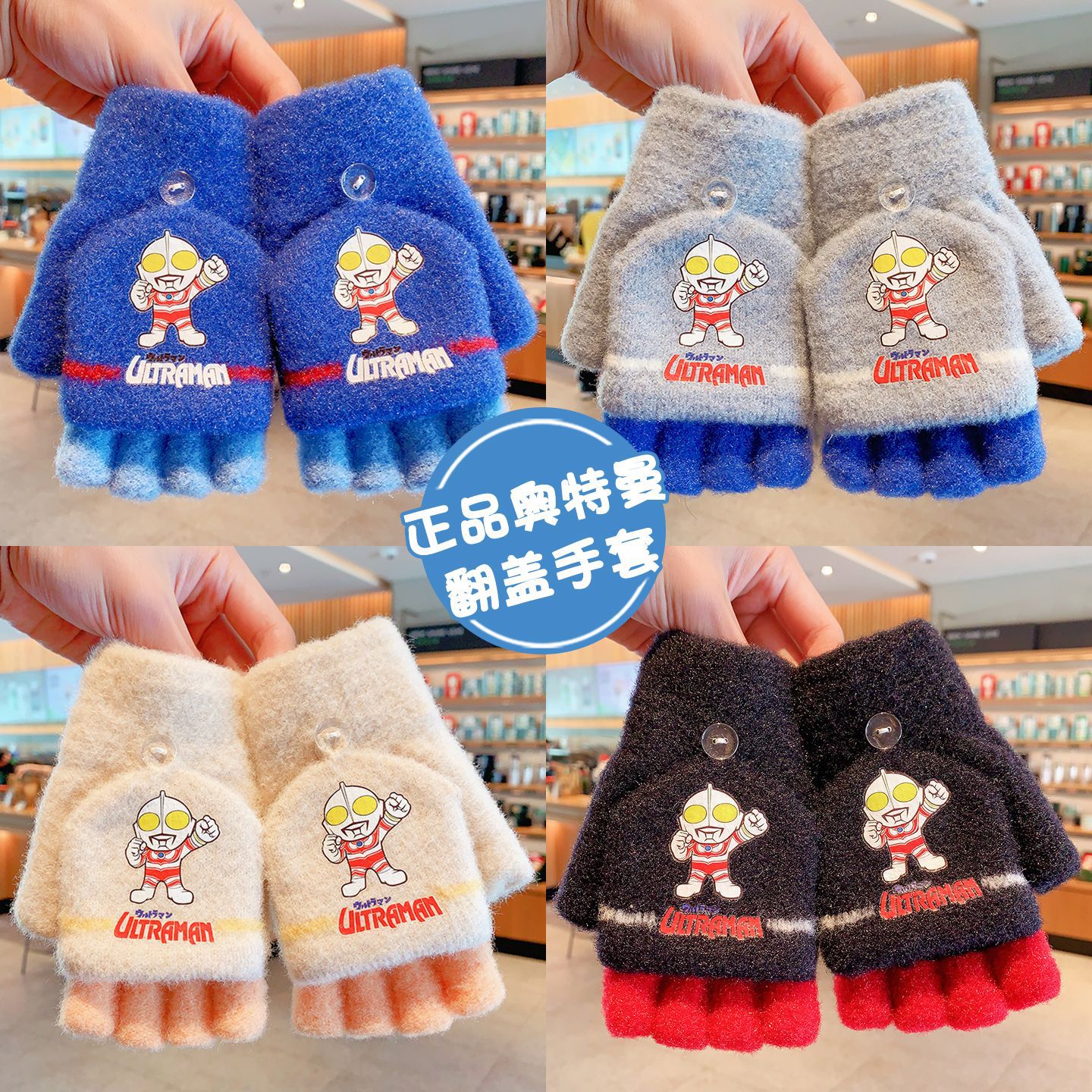 儿童可爱卡通奥特曼手套男童加厚保暖手套秋冬季小孩半指翻盖手套