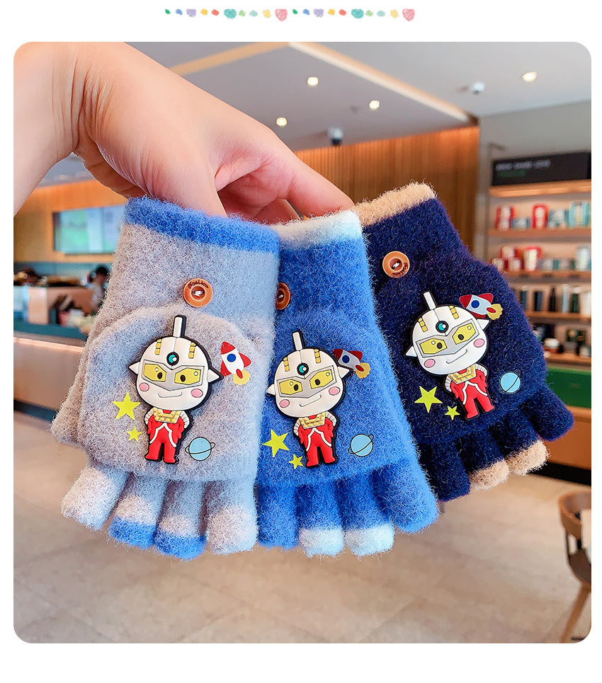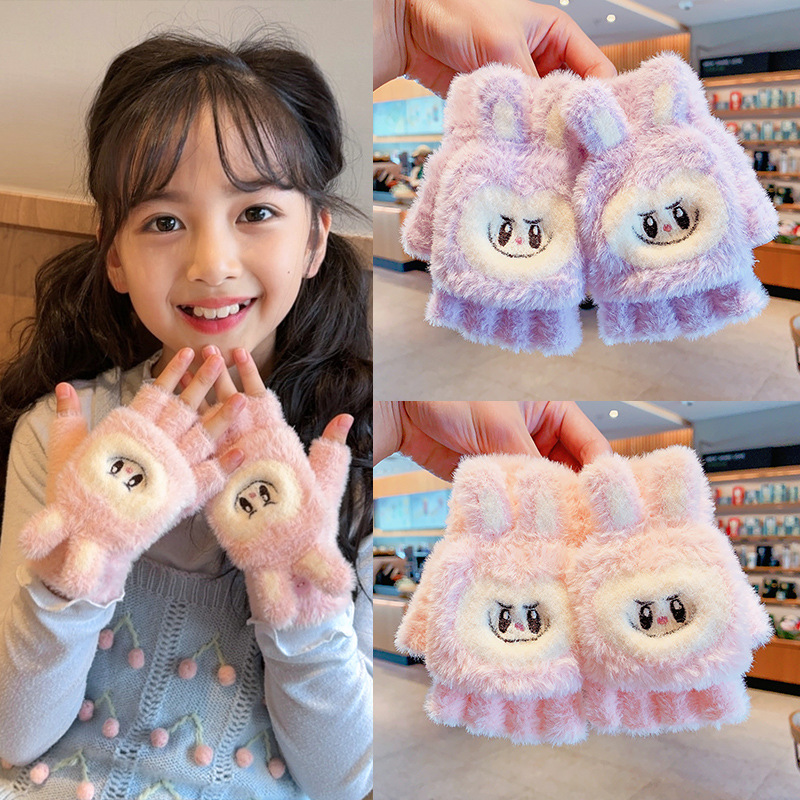 儿童珊瑚绒翻盖手套保暖公仔小学生卡通加厚半指冬天男童全指手套