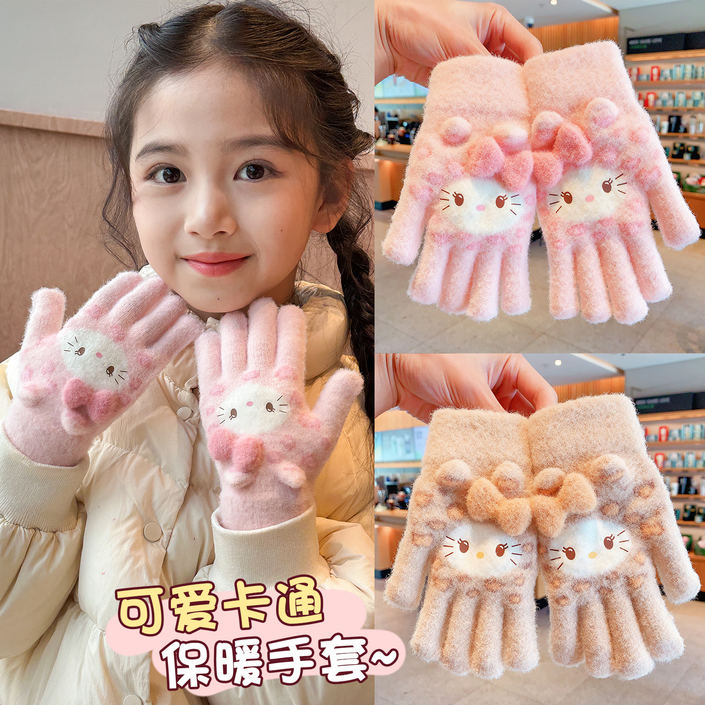 儿童五指手套女童冬天保暖防寒防冻kitty猫小孩学生加厚分指手套