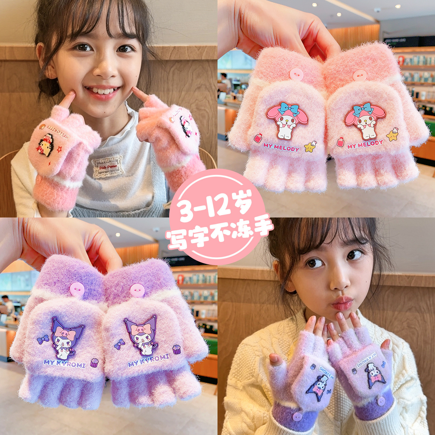 儿童半指翻盖手套女童库洛米五指冬季保暖卡通中大童学生露指防寒