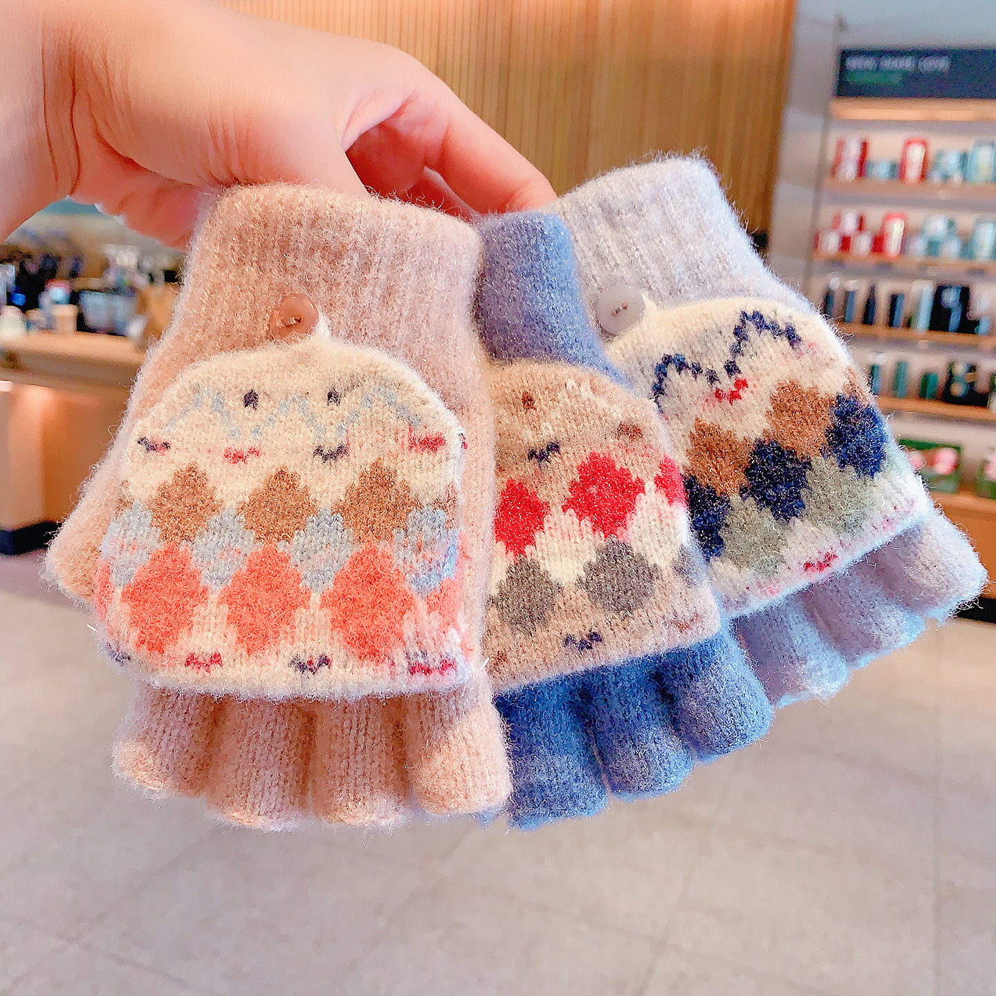 新款儿童加绒加厚保暖手套卡通半指翻盖冬季针织儿童保暖手套批发