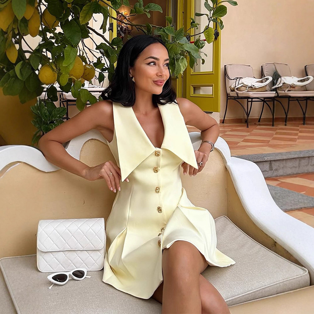純粋な欲望スタイルのシンプルなカジュアルスタイルのノースリーブラペルボタンウエストドレスショートスカート2025クロスボーダー外国貿易ヨーロッパとアメリカンスタイル