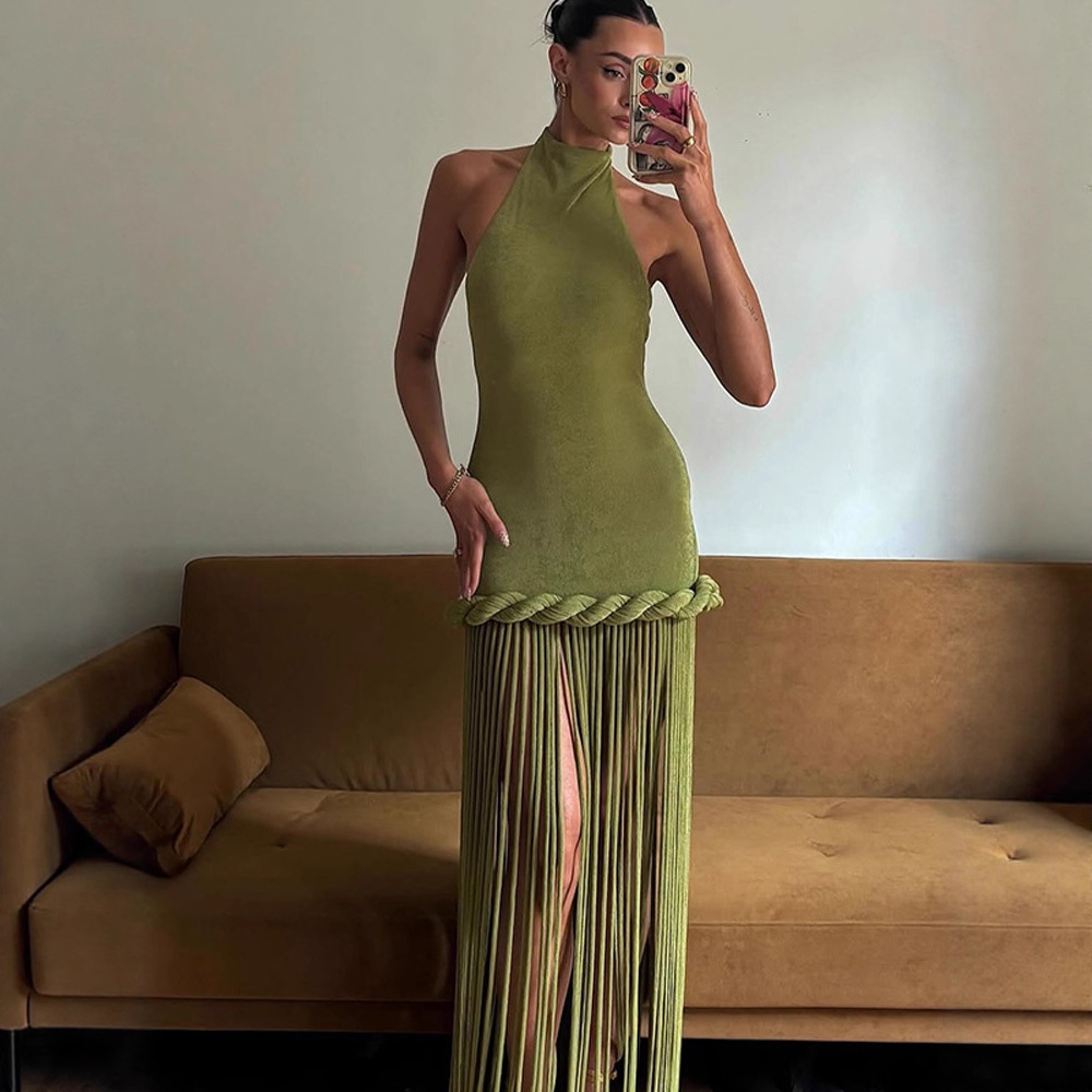 小众设计感礼服拼接流苏下摆挂脖露背连衣裙2025秋季新款跨境欧美