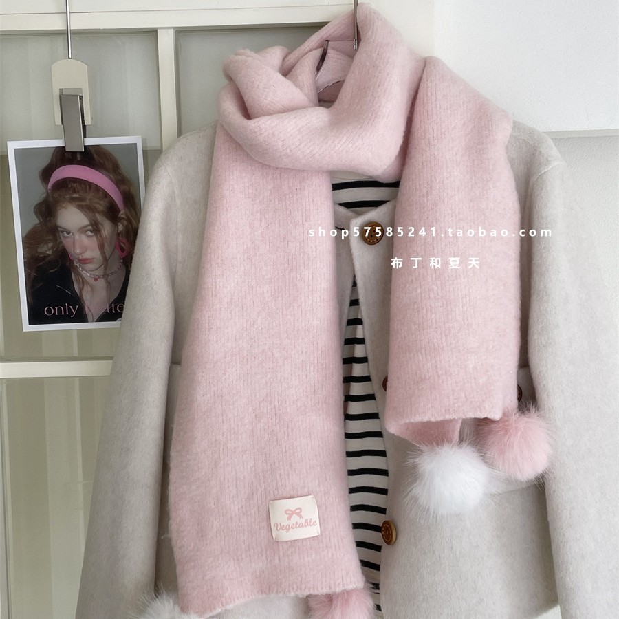 出口日韩单2025新款可爱的毛球围巾仿羊绒软糯纯色围脖学生蓝色秋
