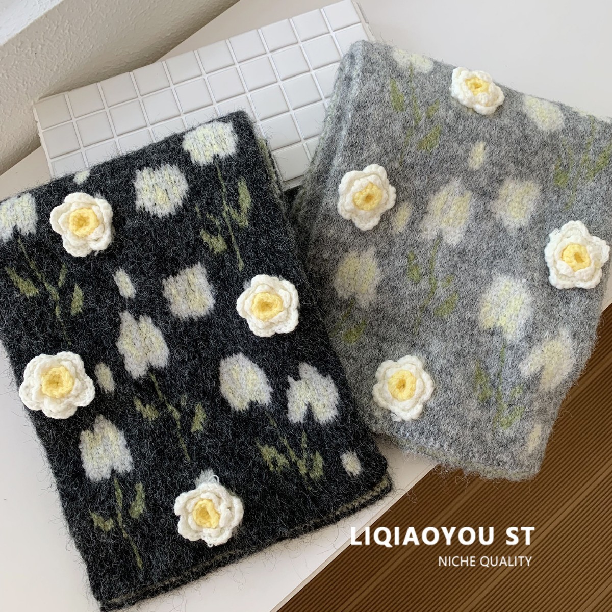 出口韩国2025新款chic含羊毛立体手工山茶花针织围巾女秋冬保暖围