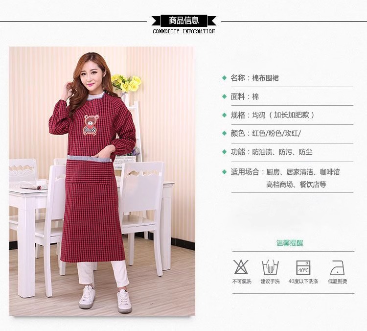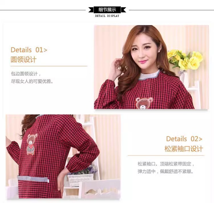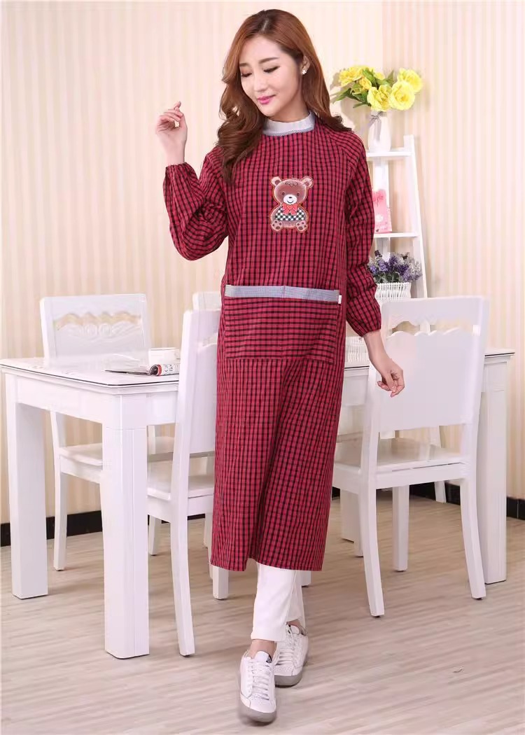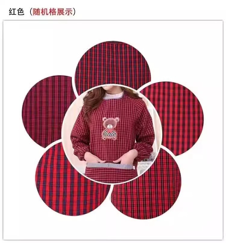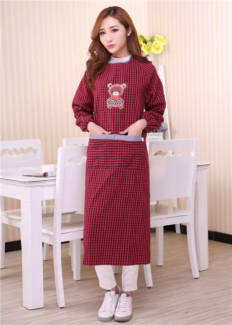 純綿長袖エプロン大ポケット綿格カバー大人家庭用キッチン料理通気袖付き防汚エプロン