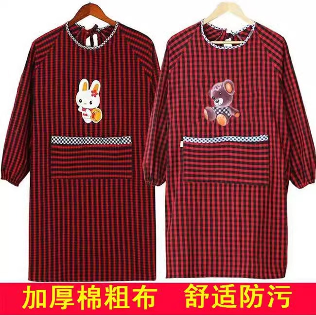 网红韩版老粗布围裙可爱格子带袖居家罩衣成人罩衣围裙反穿衣加厚