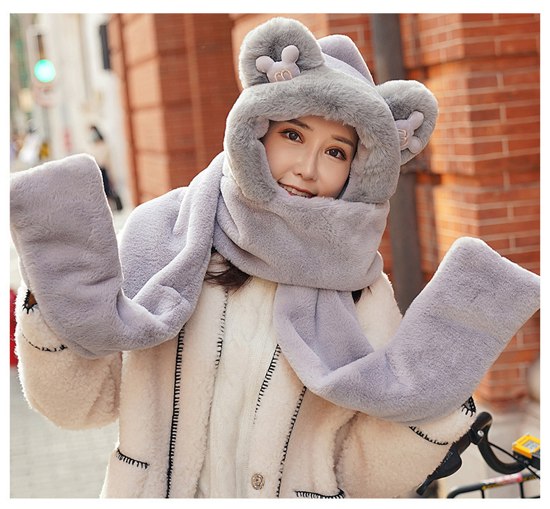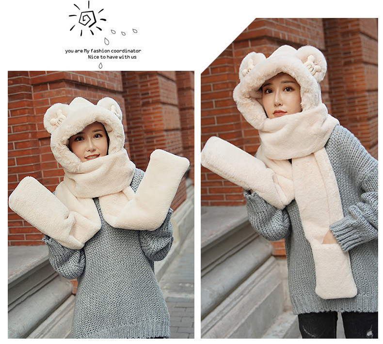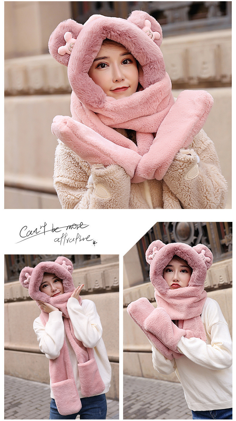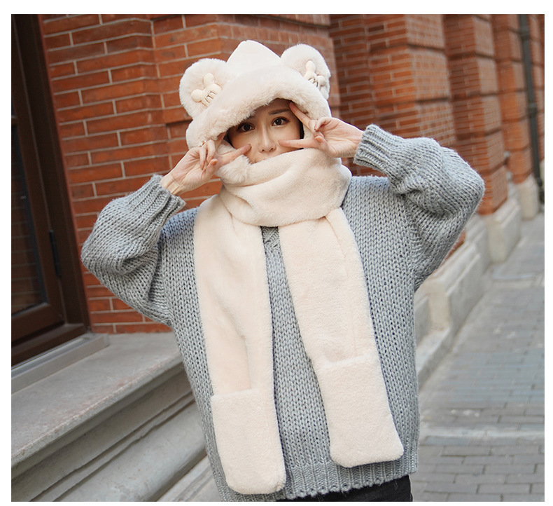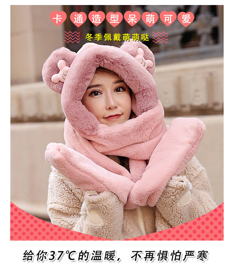 可爱小熊围巾帽子两件套女冬季保暖防寒一体连帽毛绒护耳围脖新款
