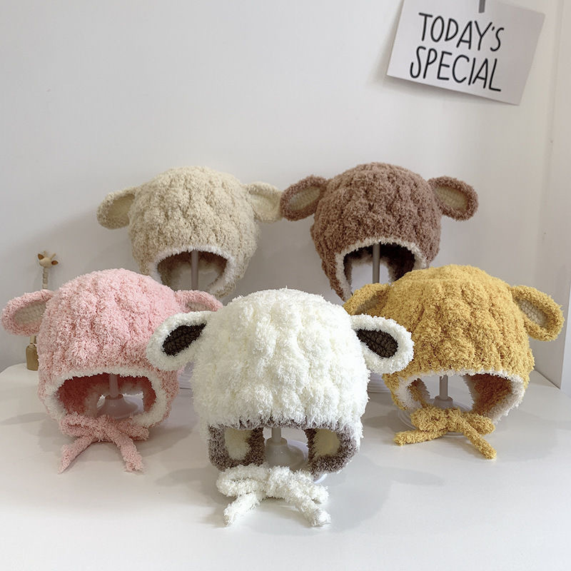 婴儿帽子冬季小羊耳朵头套可爱男女宝宝保暖防风室外羊羔毛护耳帽