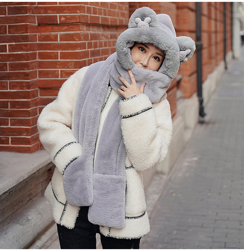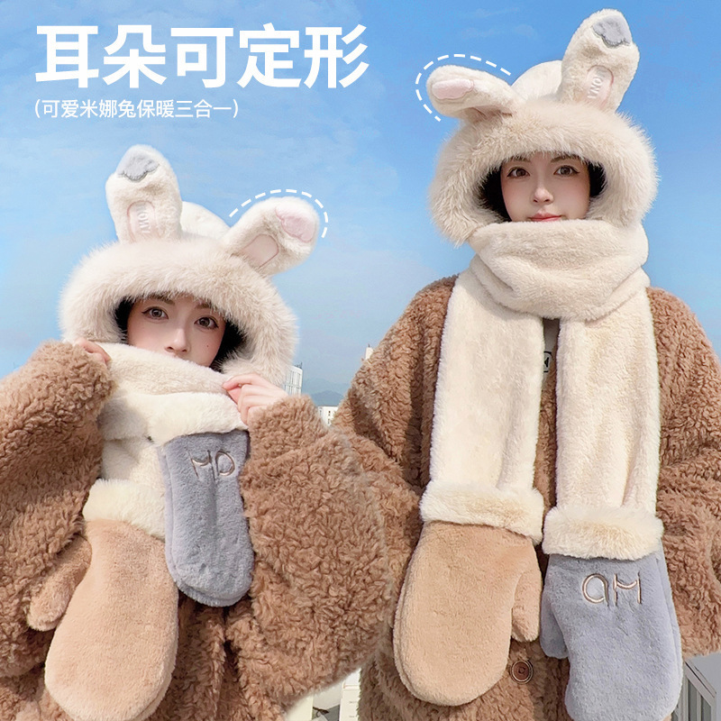 兔耳朵三件套毛绒女帽子围巾手套一体秋冬加绒加厚骑车保暖新款帽