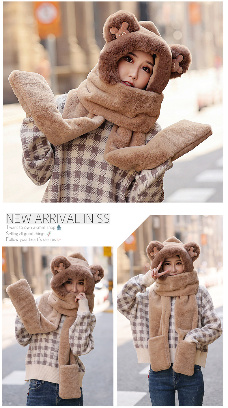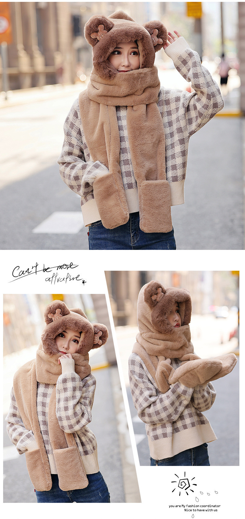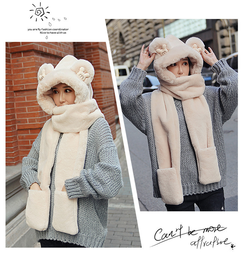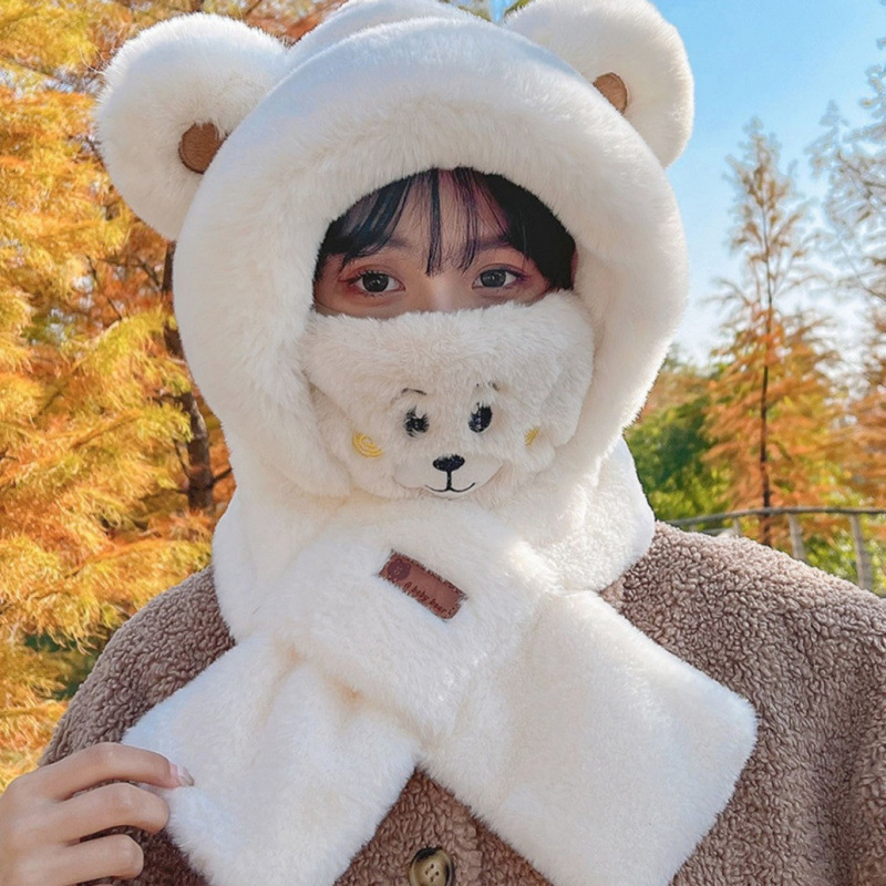 帽子围巾一体两件套女新小熊毛绒可爱防寒连体帽冬季学生保暖围脖