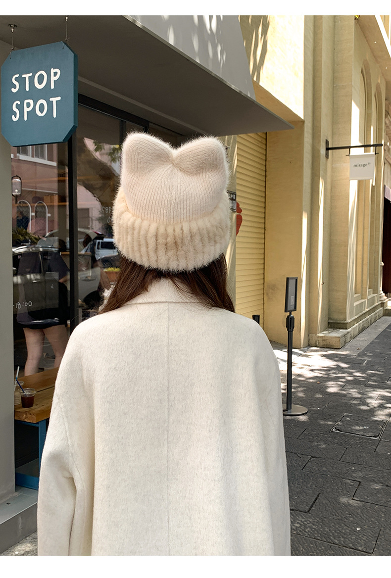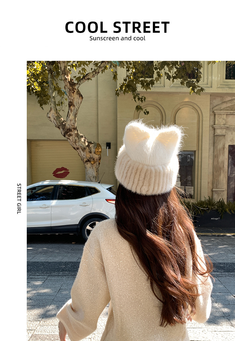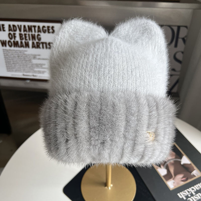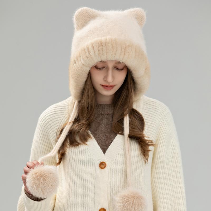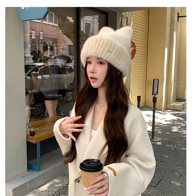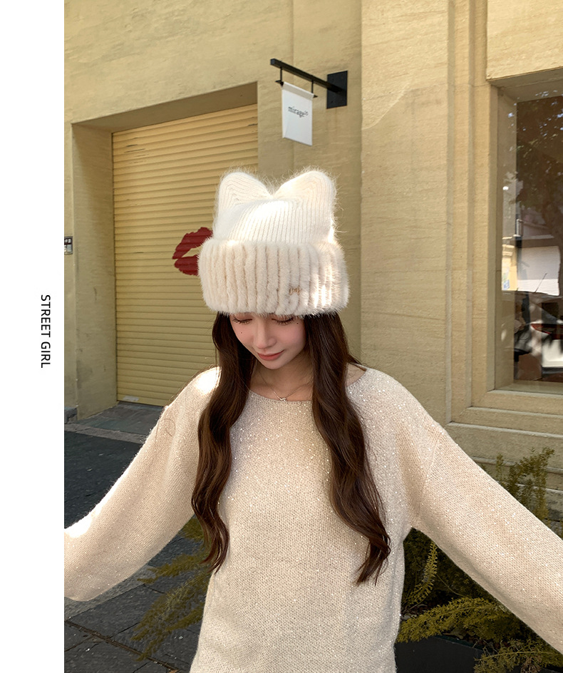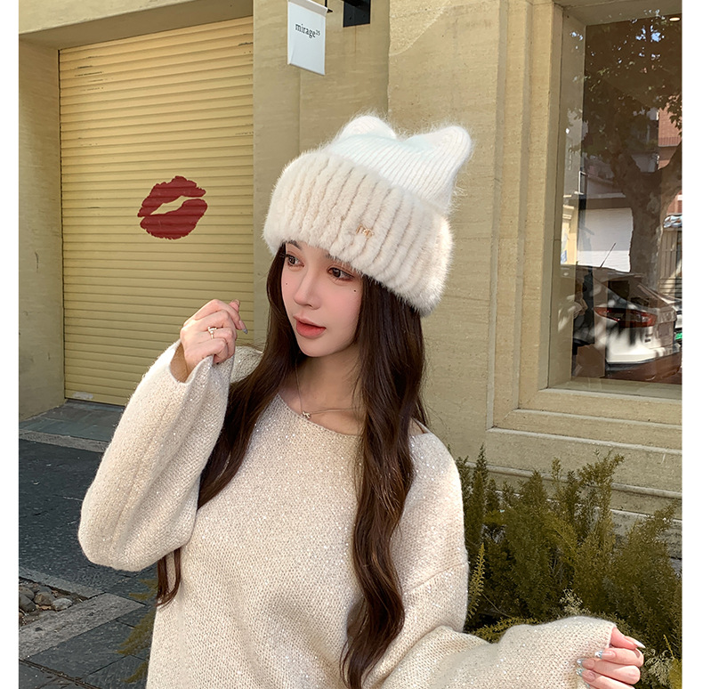 可爱毛线帽子女秋冬水貂毛韩版猫耳朵女生针织套头帽保暖加绒帽