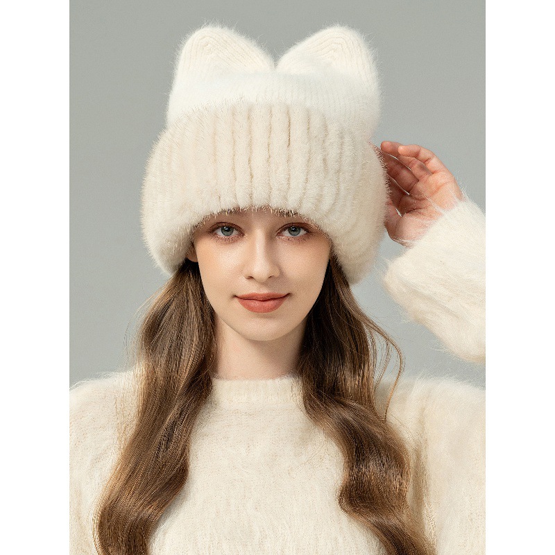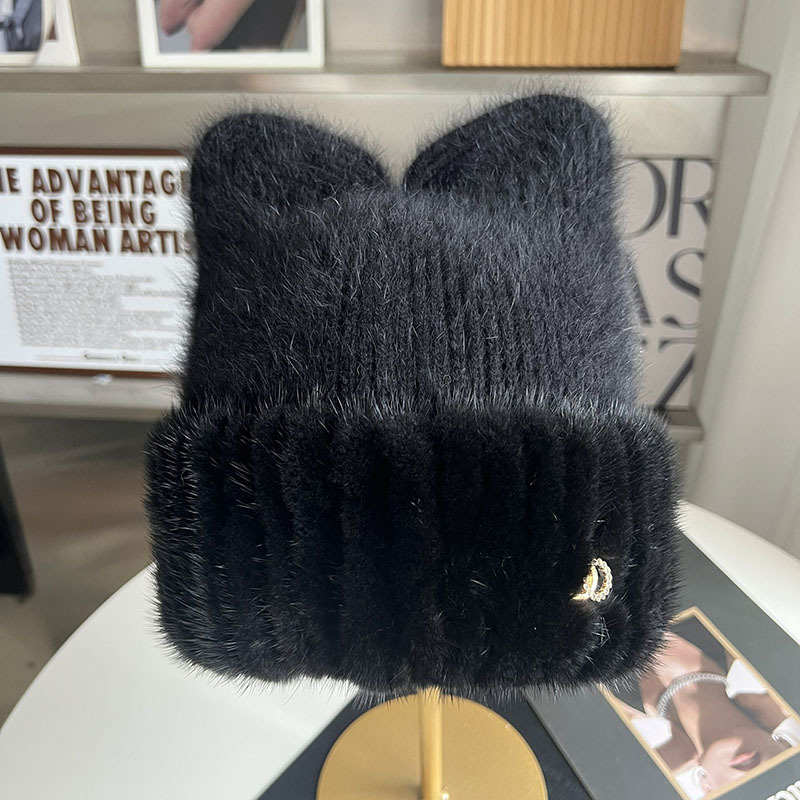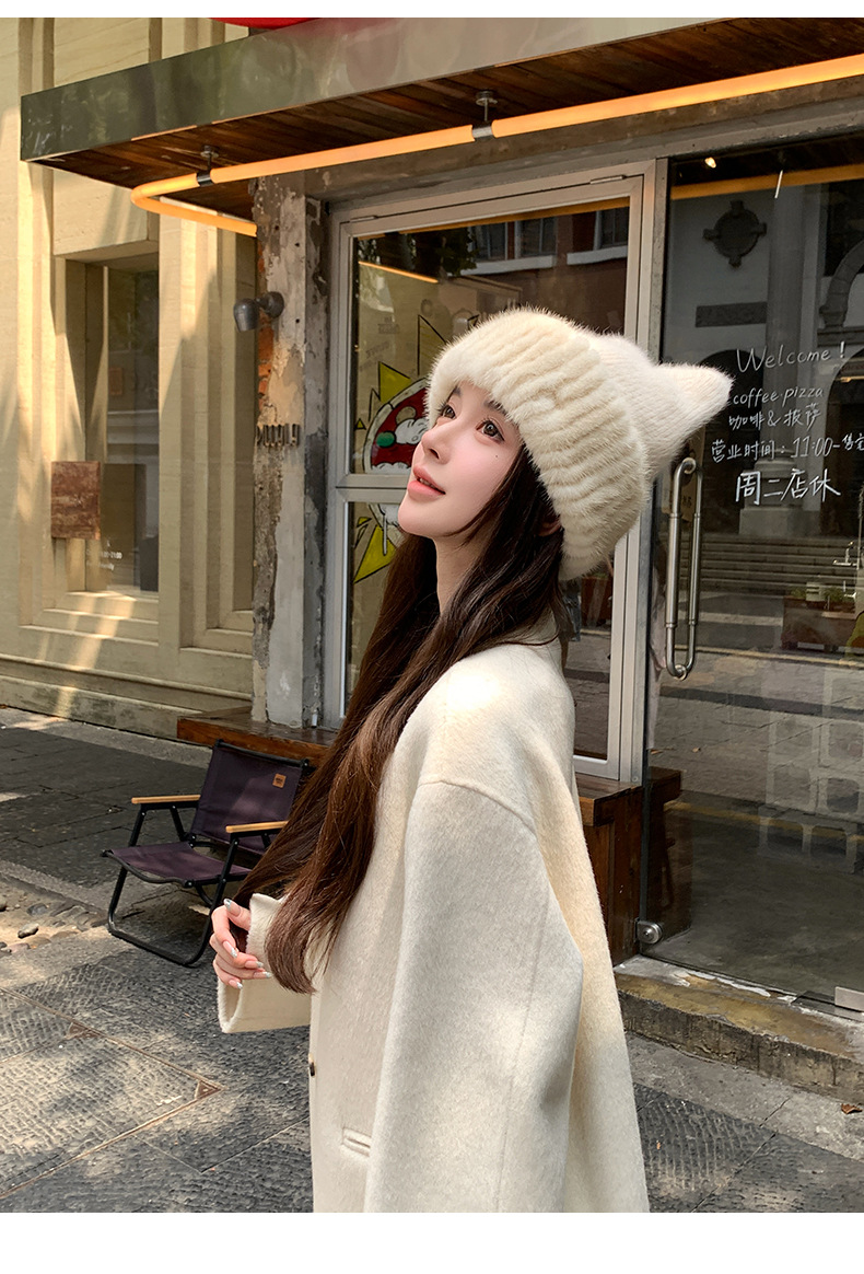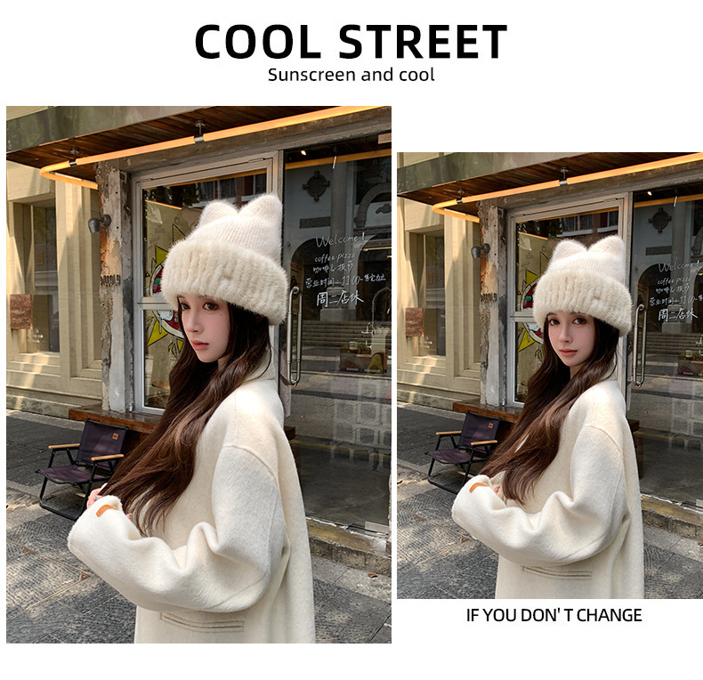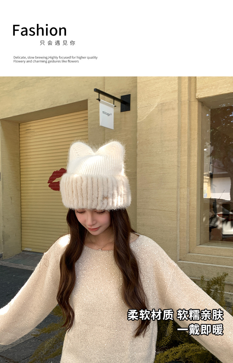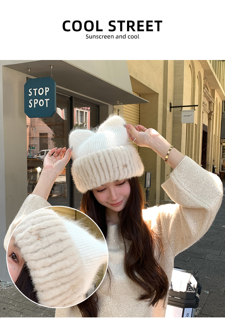 可爱毛线帽子女秋冬水貂毛韩版猫耳朵女生针织套头帽保暖加绒帽