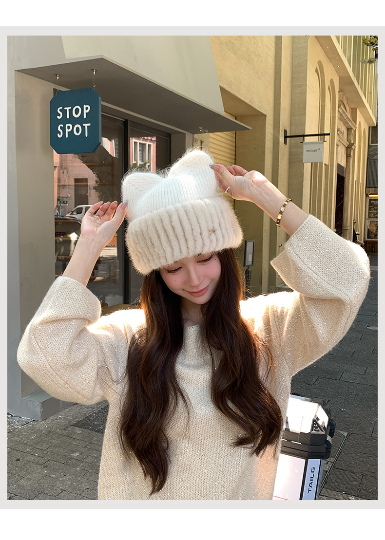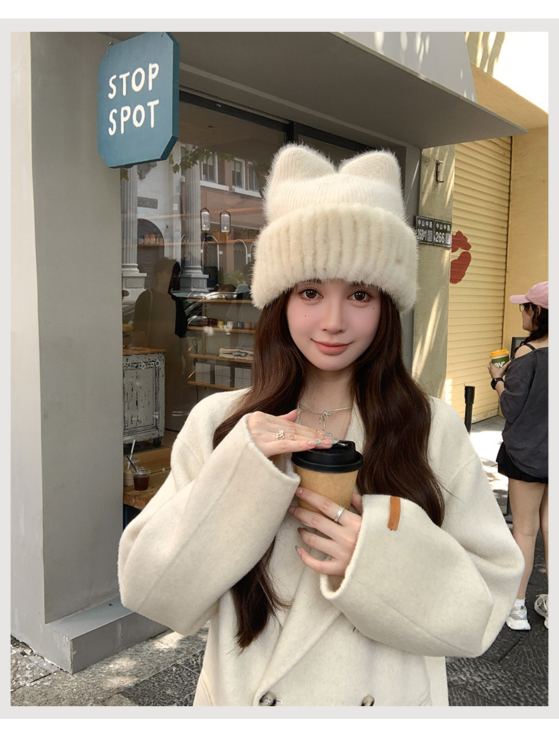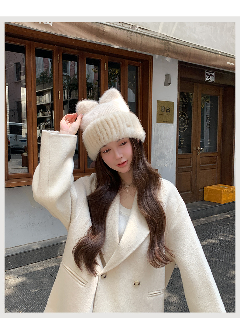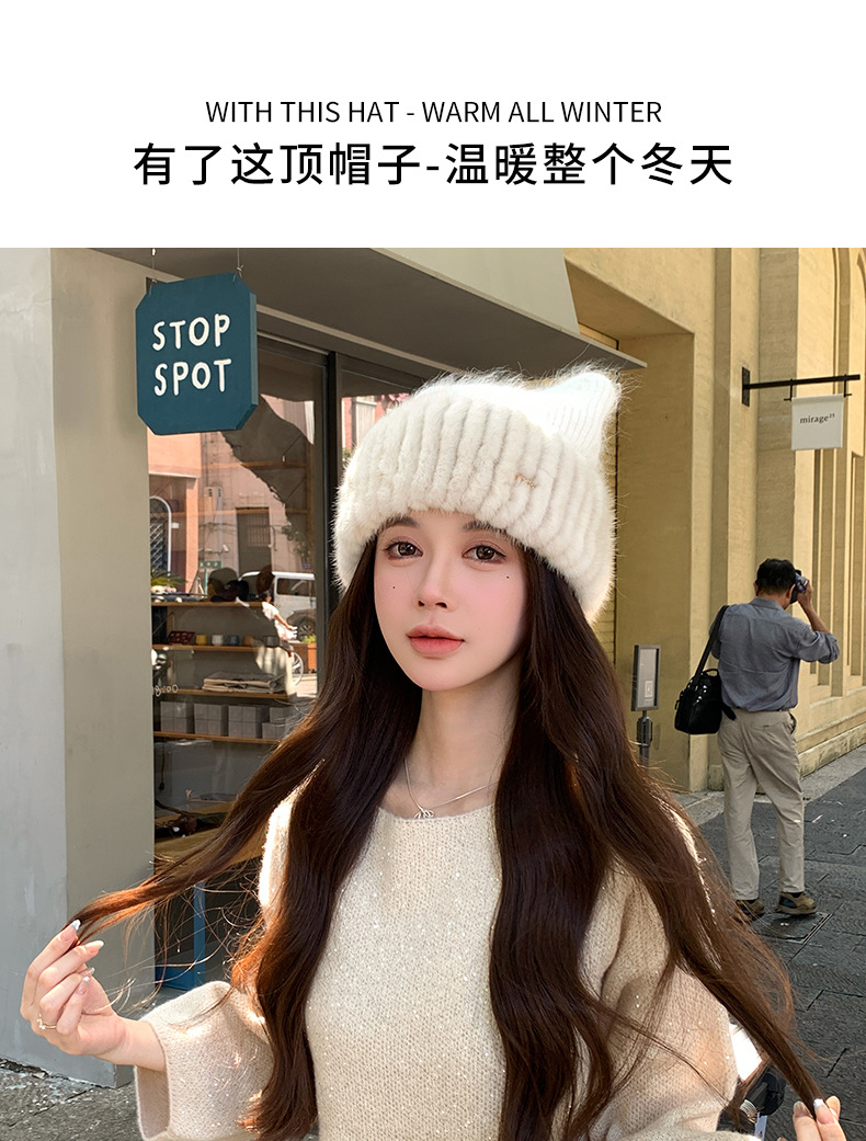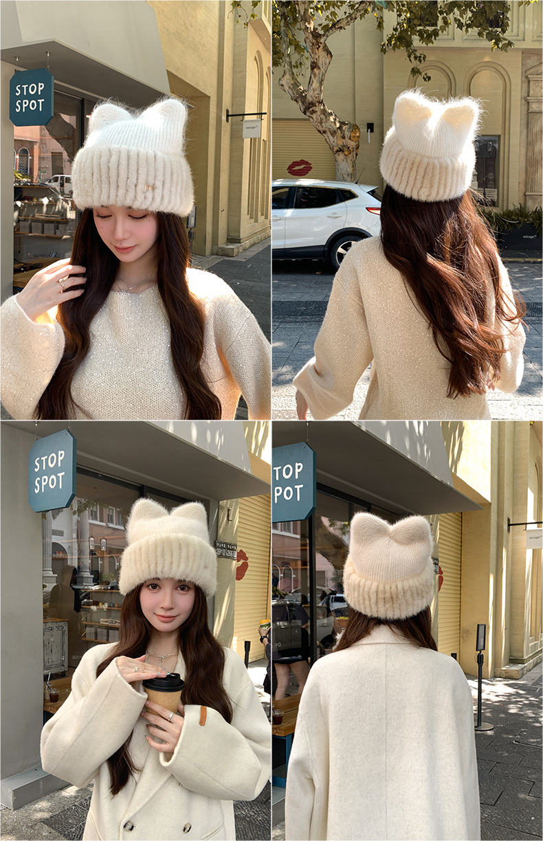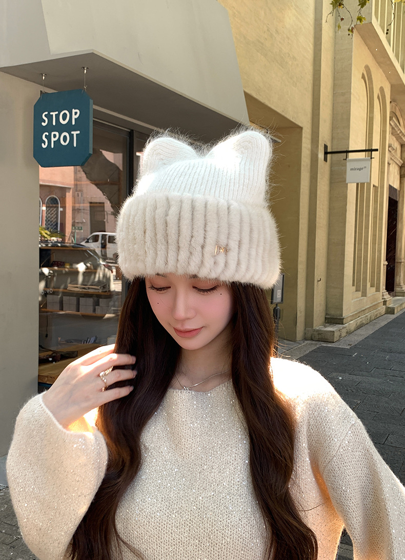 可爱毛线帽子女秋冬水貂毛韩版猫耳朵女生针织套头帽保暖加绒帽