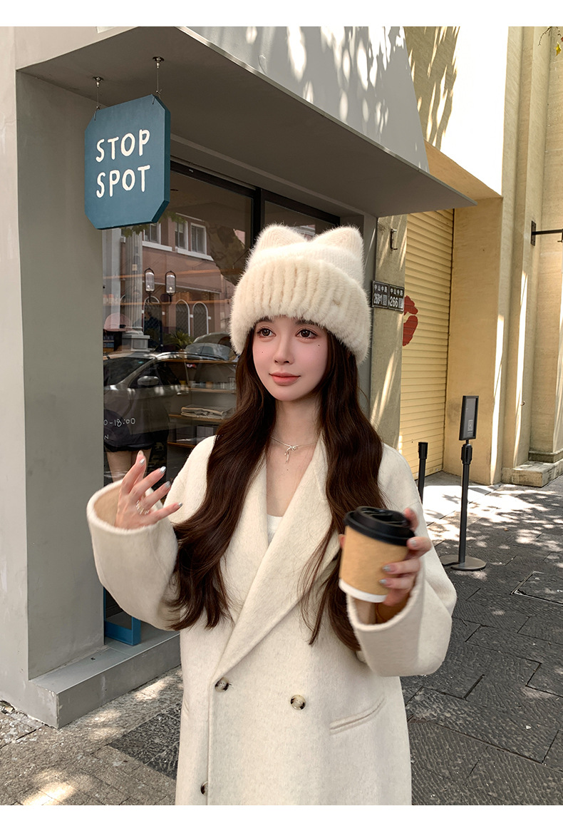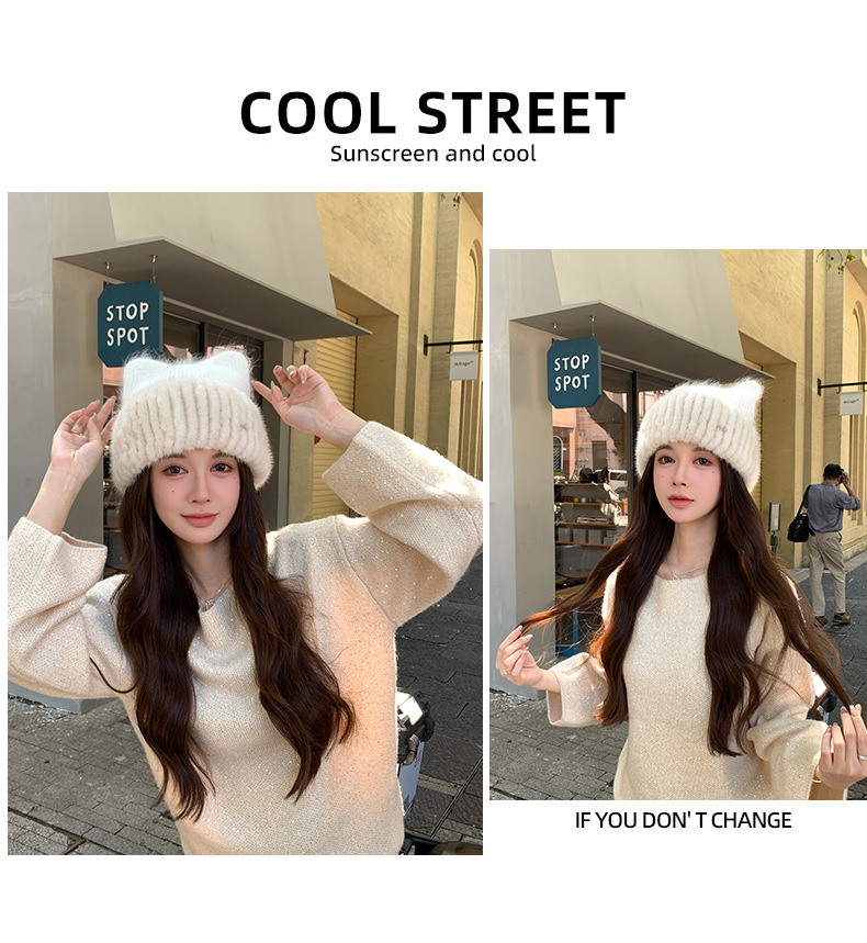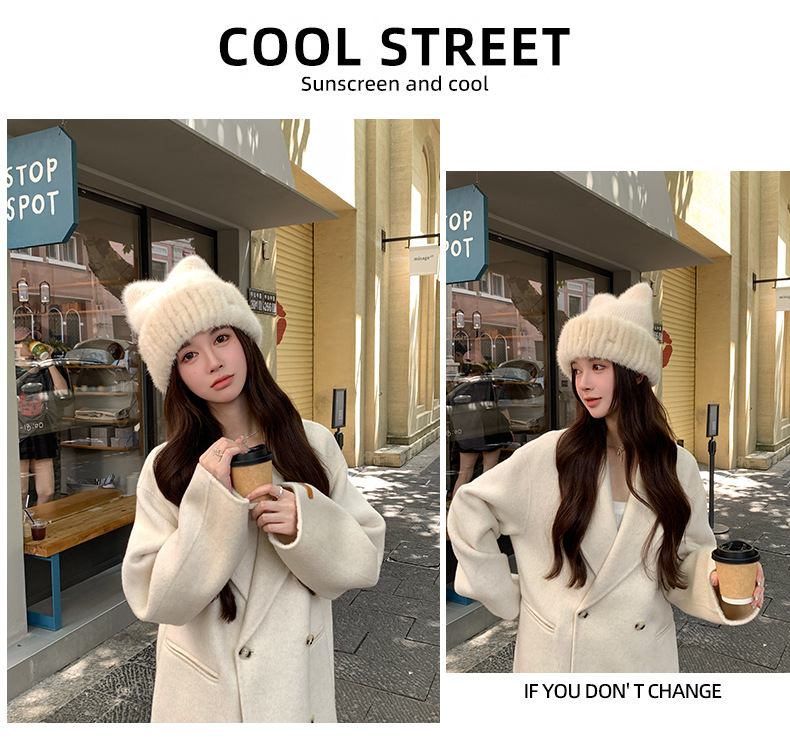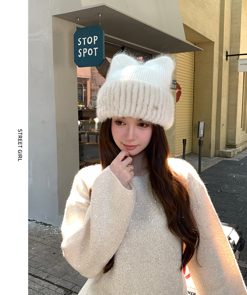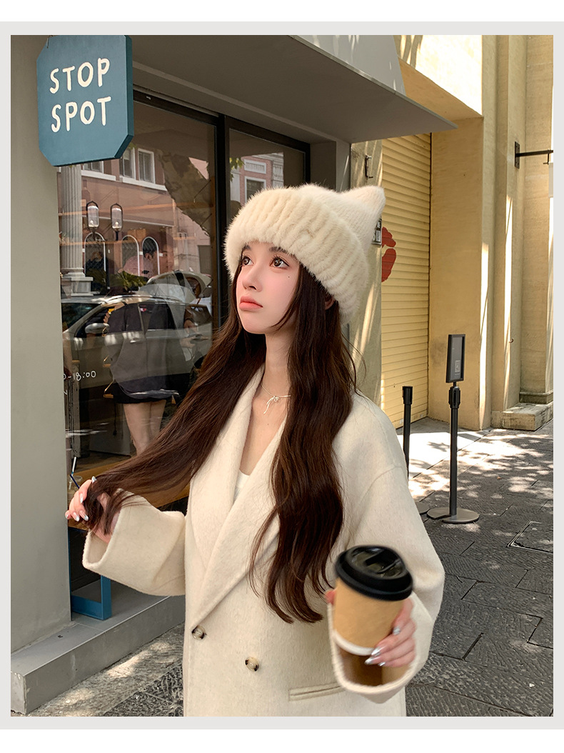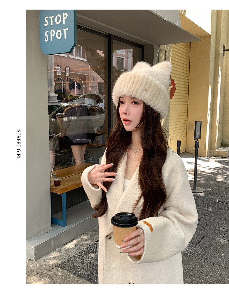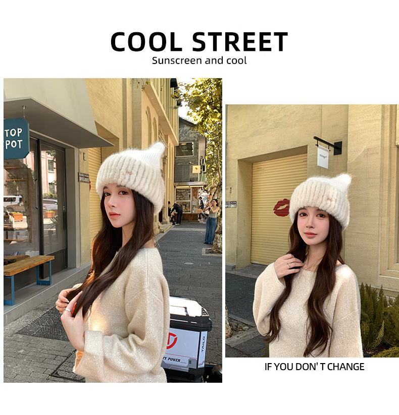可爱毛线帽子女秋冬水貂毛韩版猫耳朵女生针织套头帽保暖加绒帽