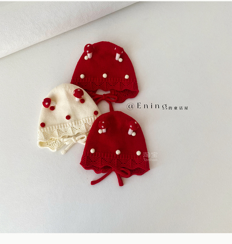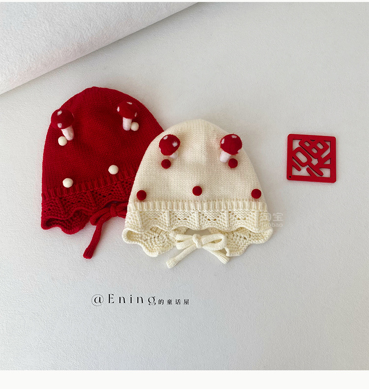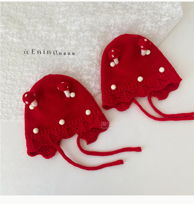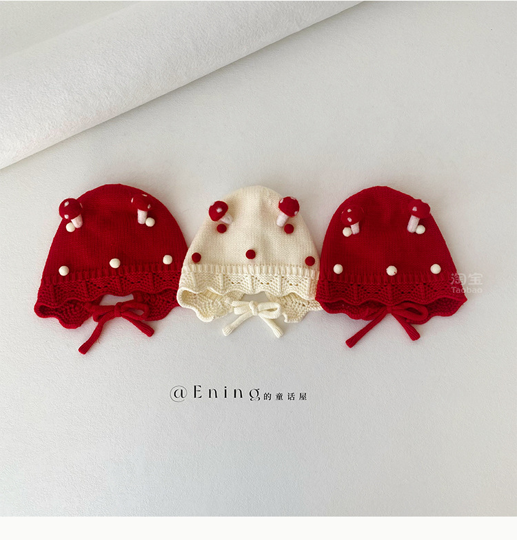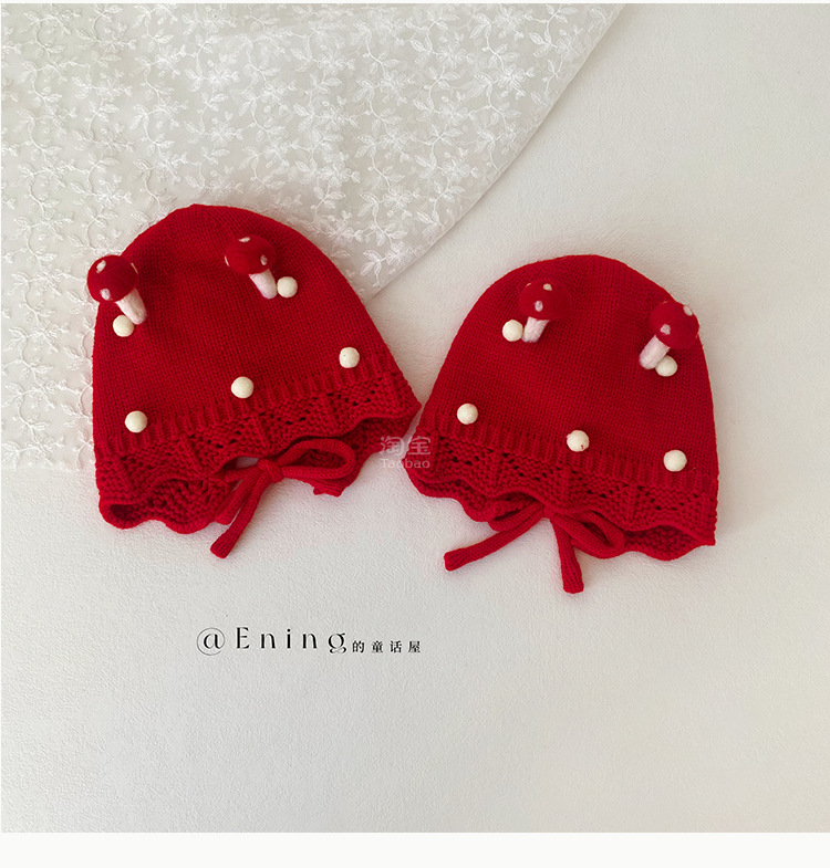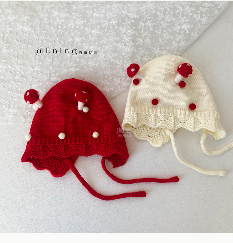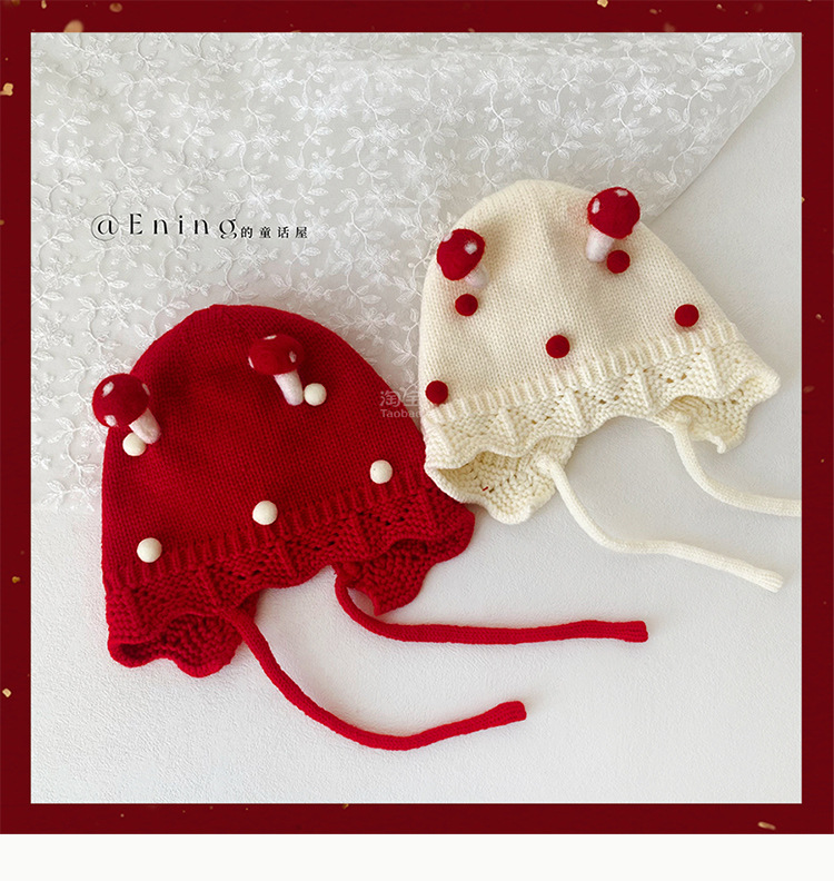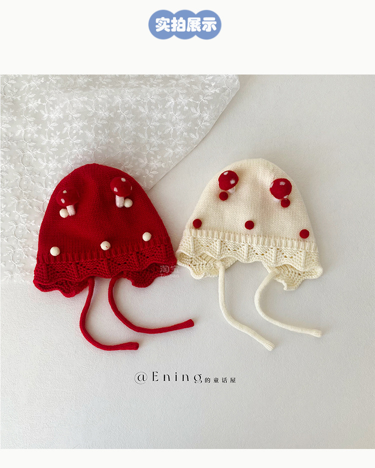 小月龄婴儿帽子秋冬季保暖外出小蘑菇宝宝针织帽子花边小童毛线帽