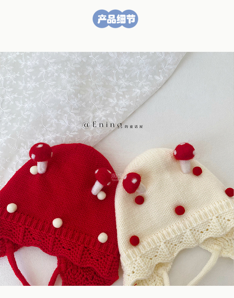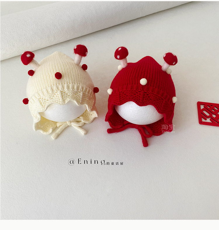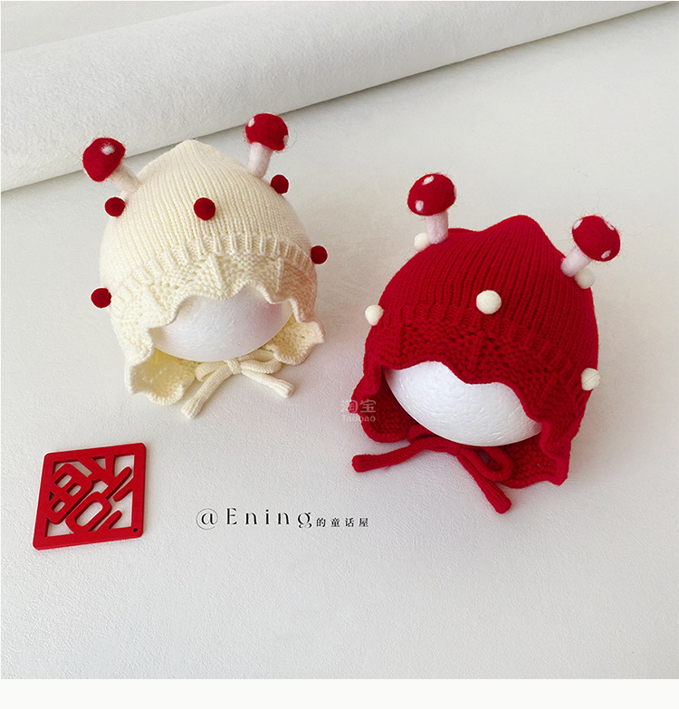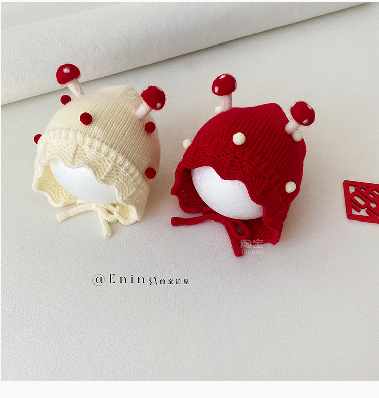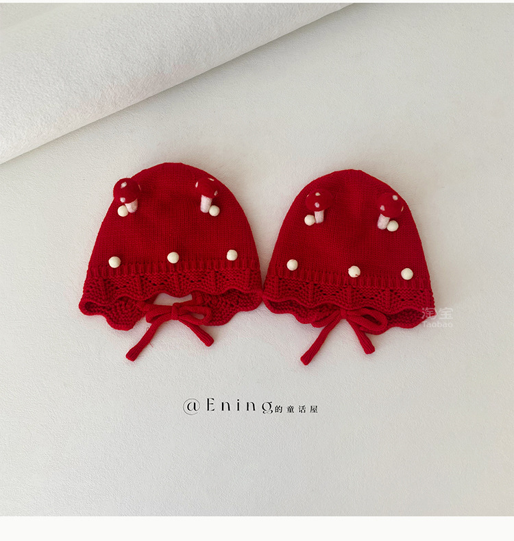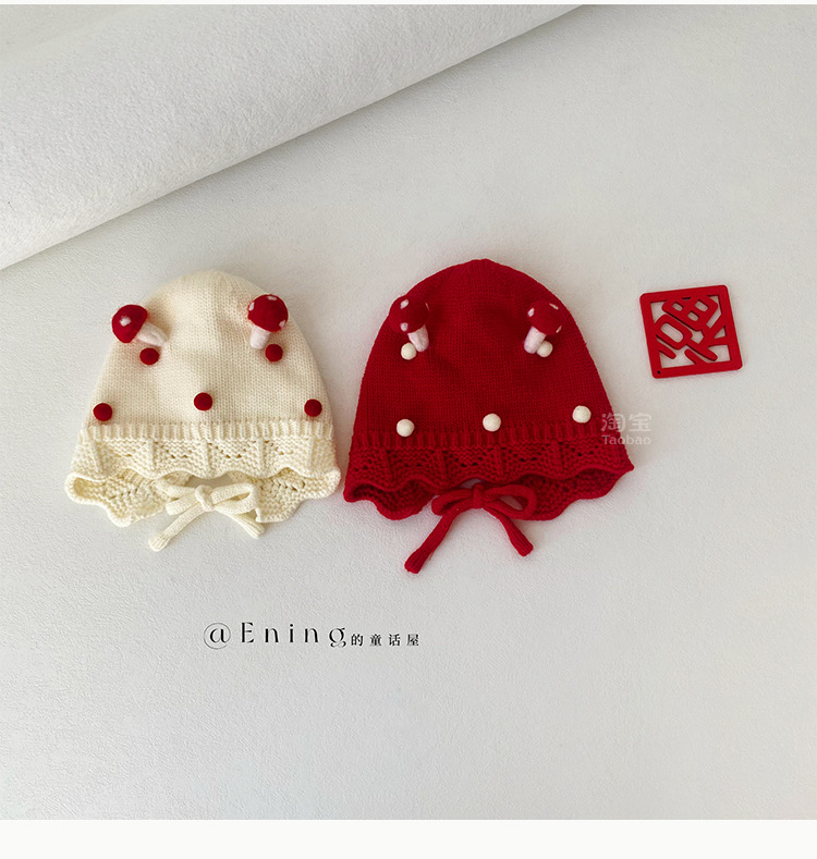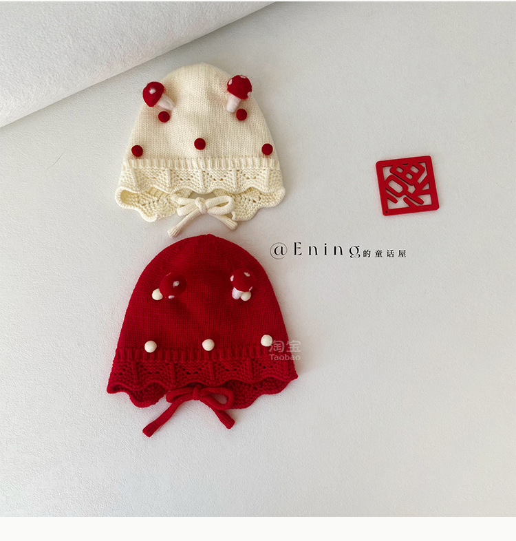 小月龄婴儿帽子秋冬季保暖外出小蘑菇宝宝针织帽子花边小童毛线帽
