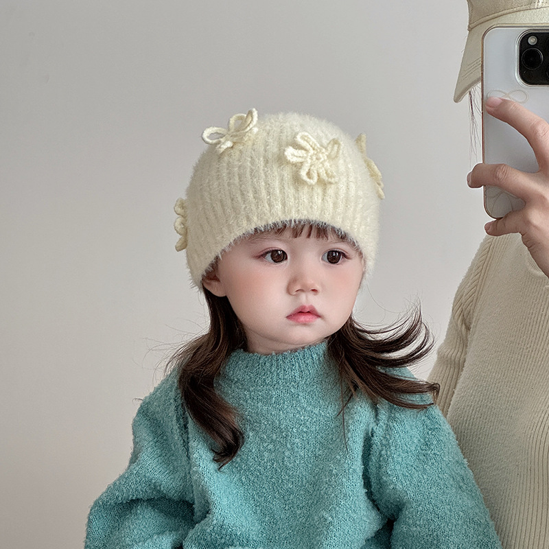 宝宝帽子冬天毛线帽可爱韩版甜美花朵针织护耳帽婴幼儿加厚保暖帽