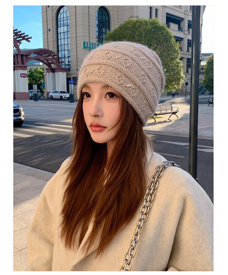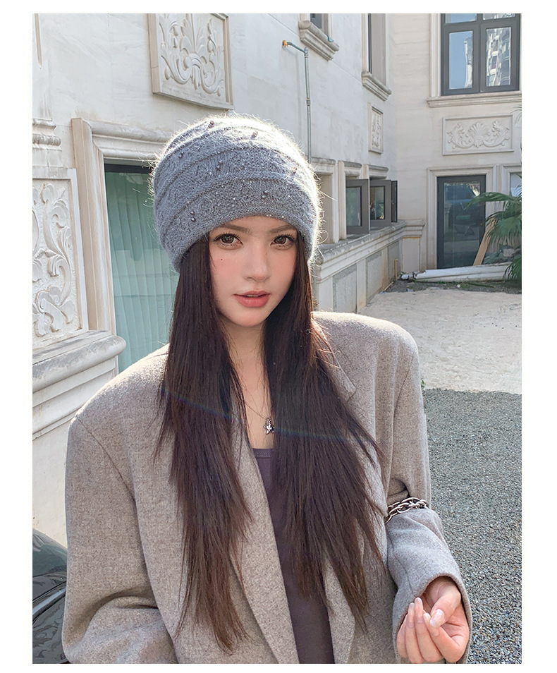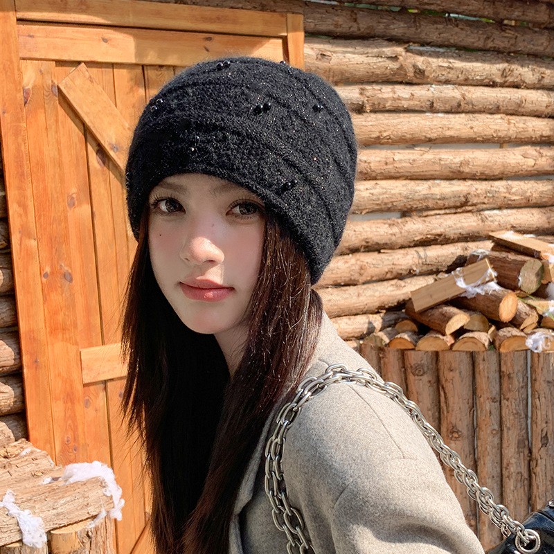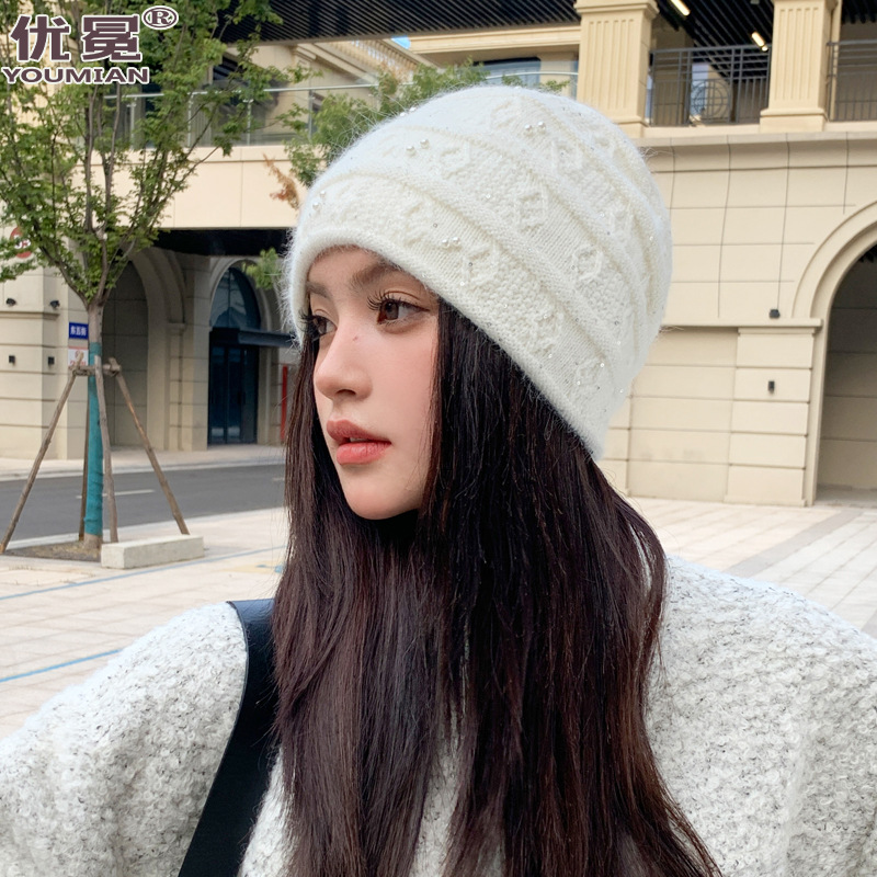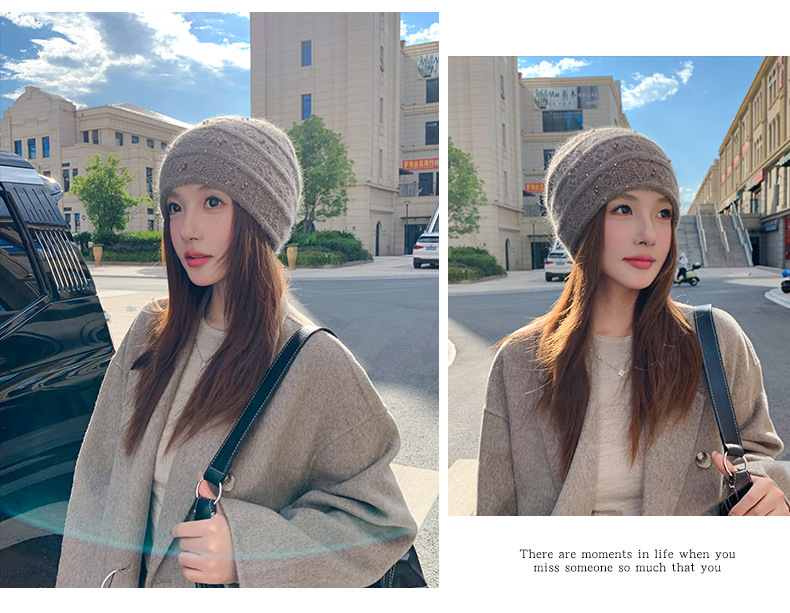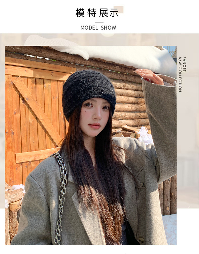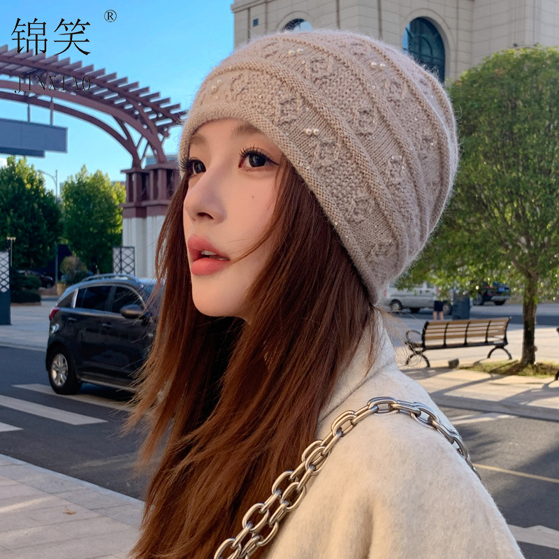 帽子女秋冬新款针织帽钉珍珠兔毛帽防寒保暖套头帽时尚亮片堆堆帽