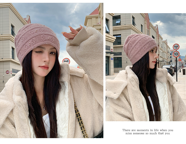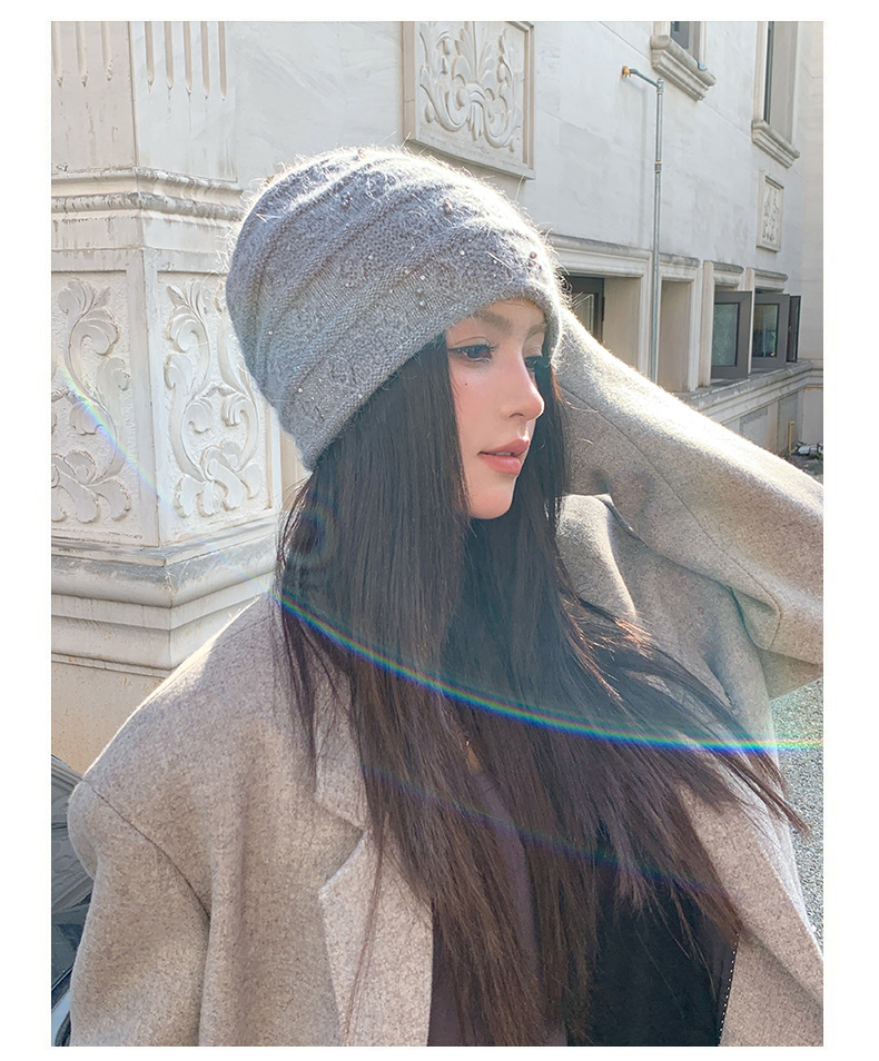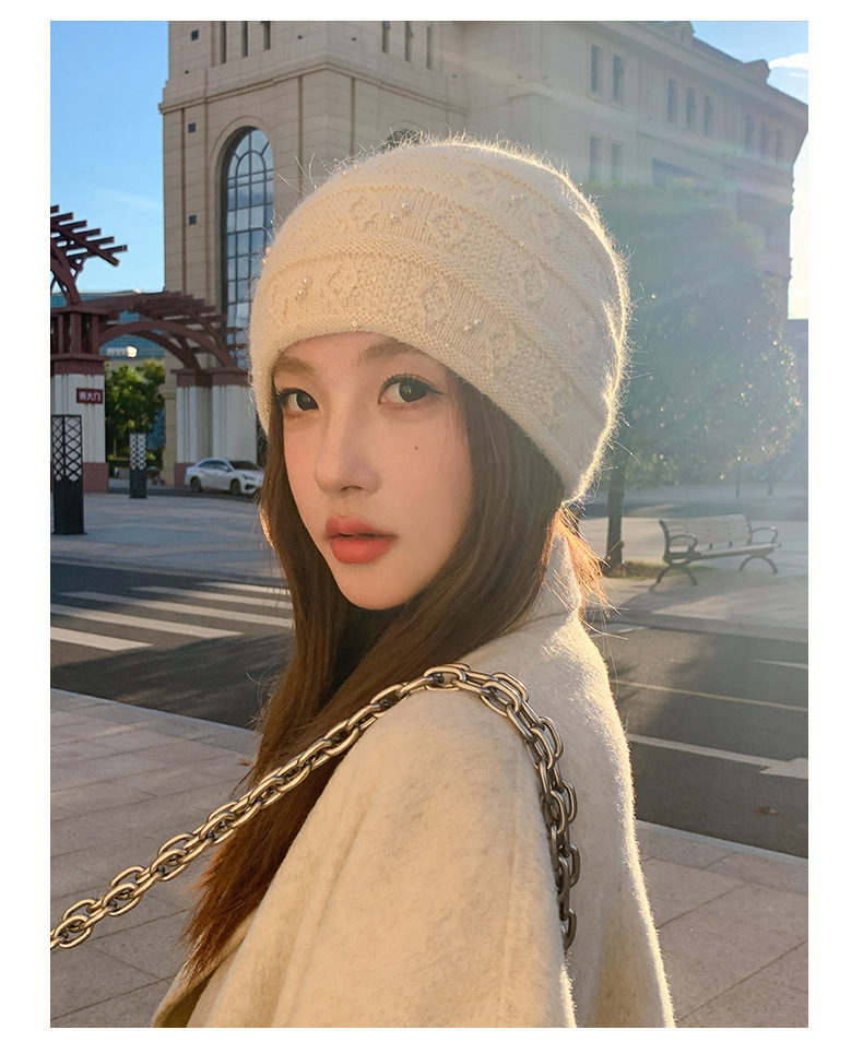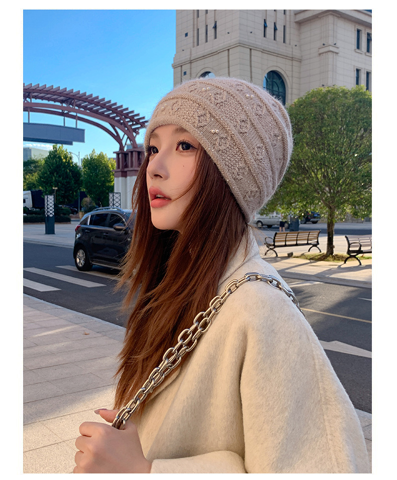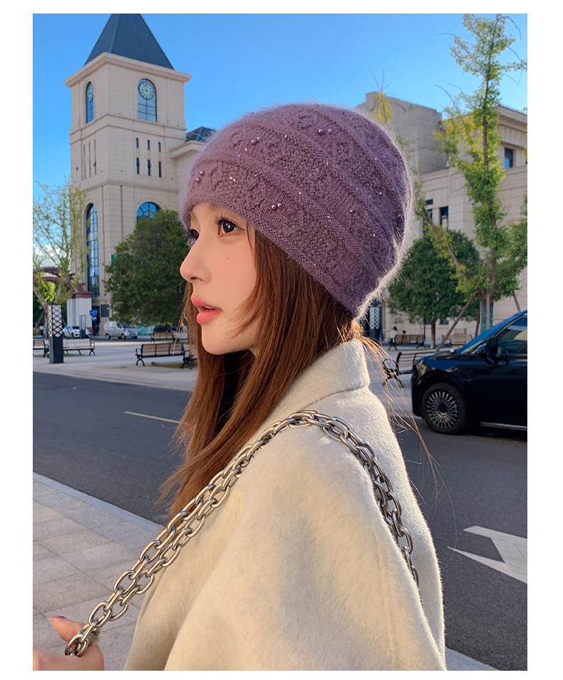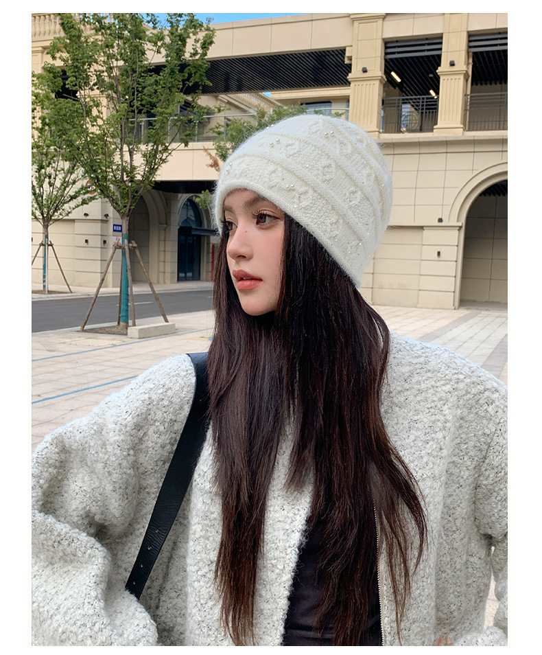 帽子女秋冬新款针织帽钉珍珠兔毛帽防寒保暖套头帽时尚亮片堆堆帽