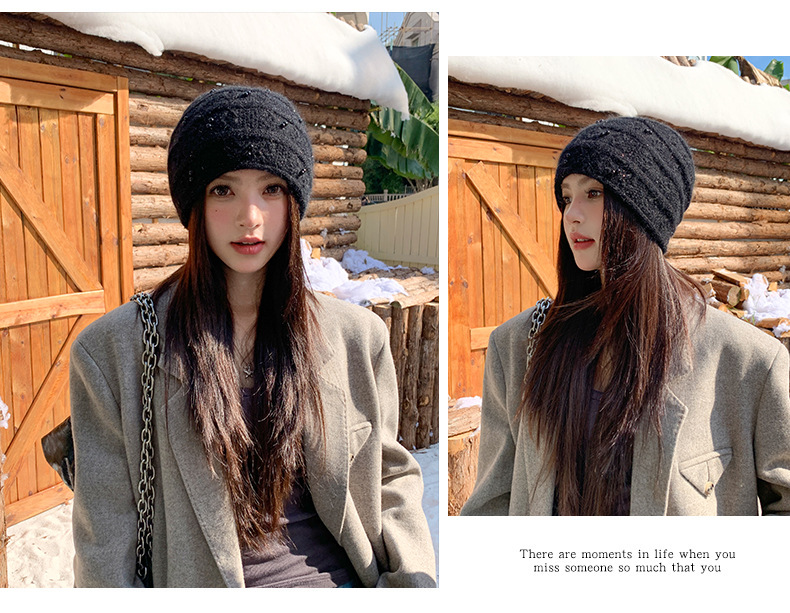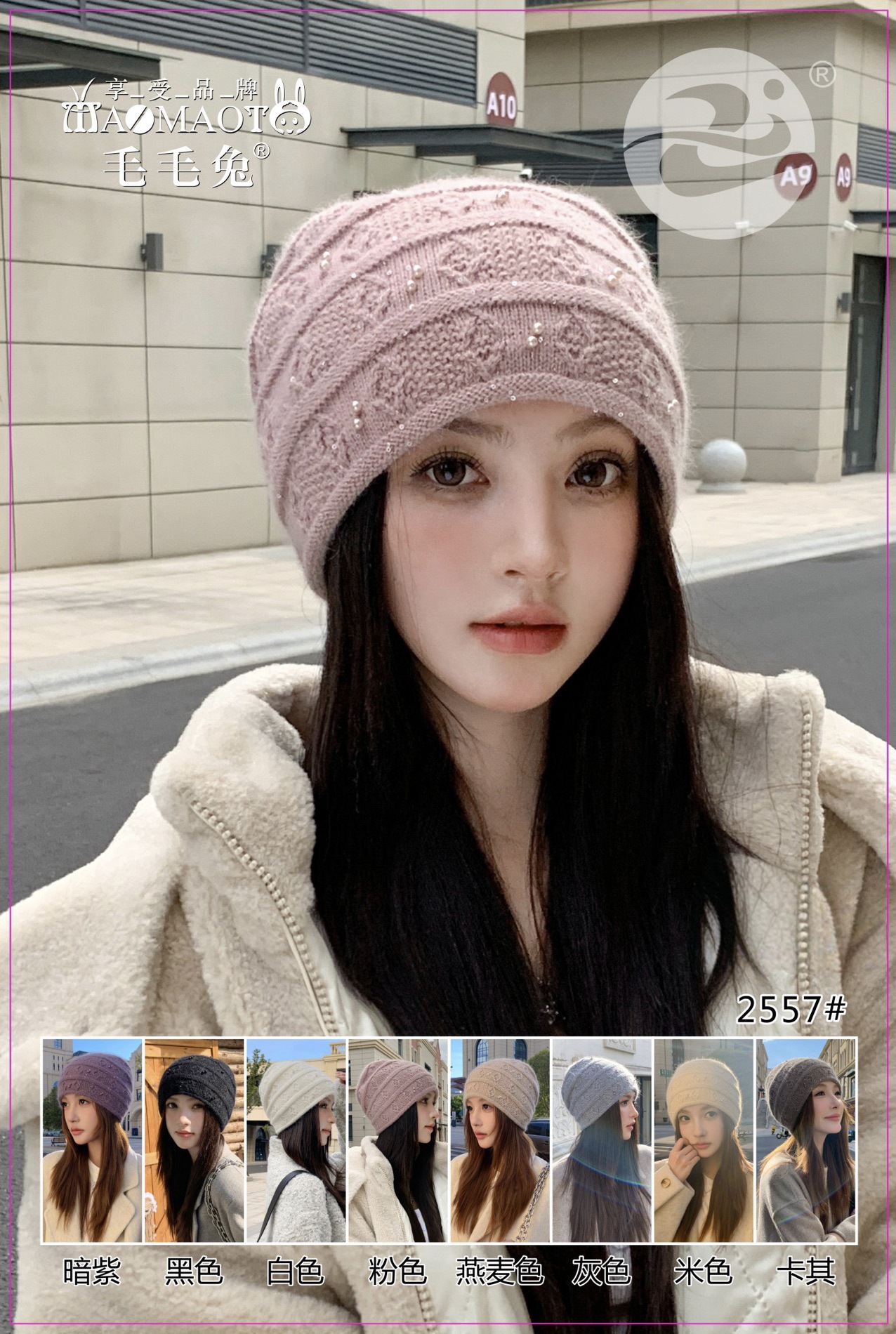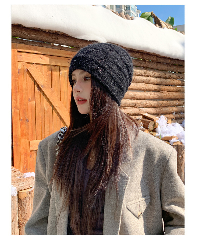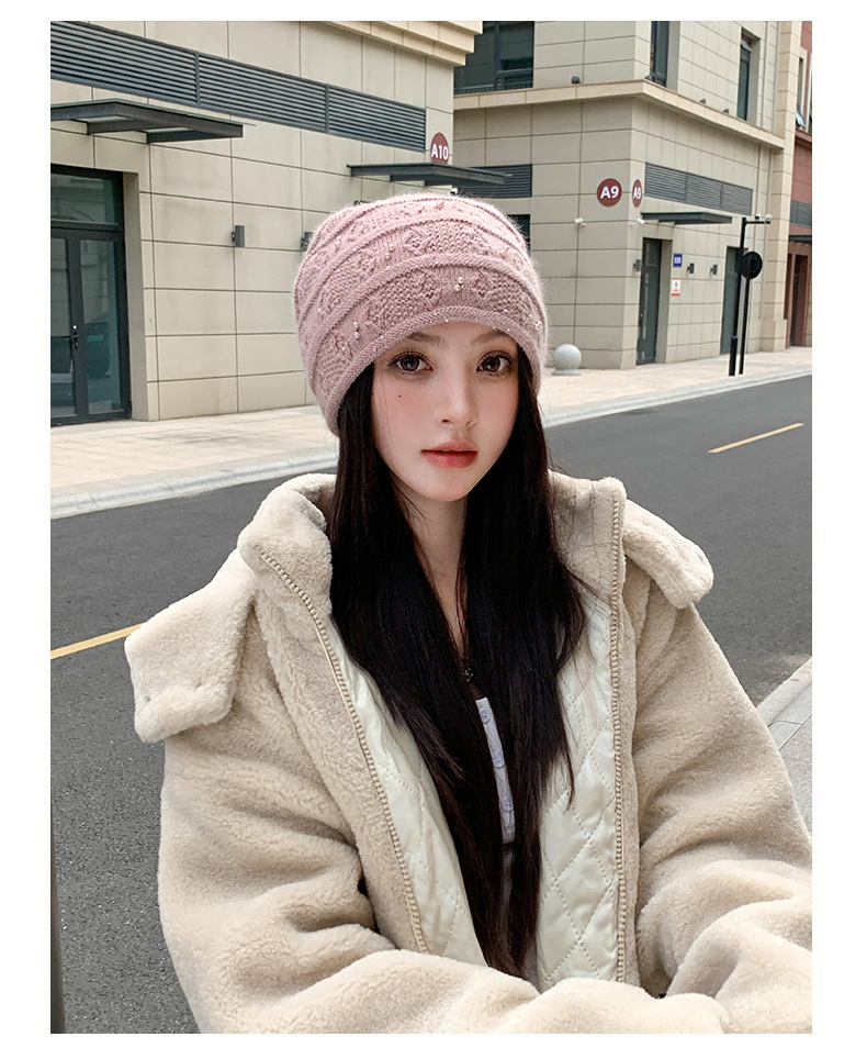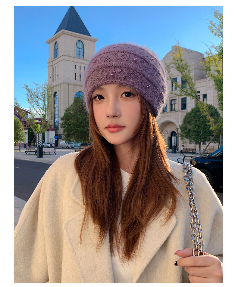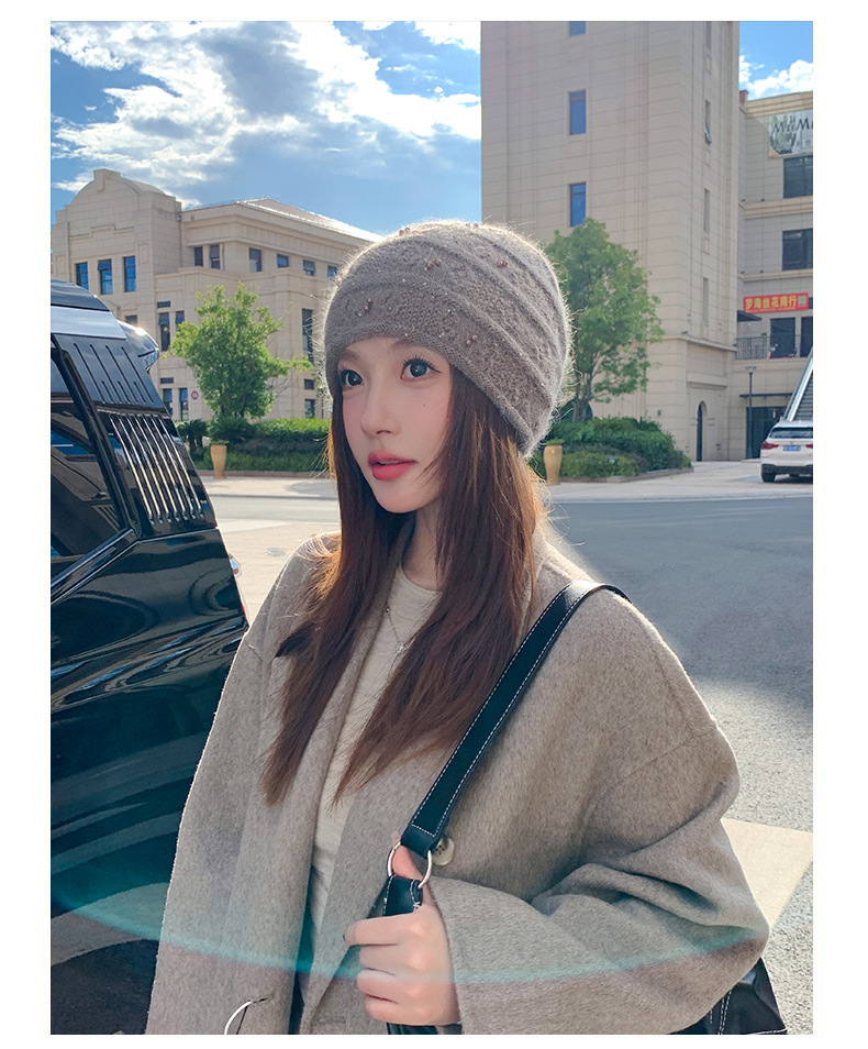 帽子女秋冬新款针织帽钉珍珠兔毛帽防寒保暖套头帽时尚亮片堆堆帽