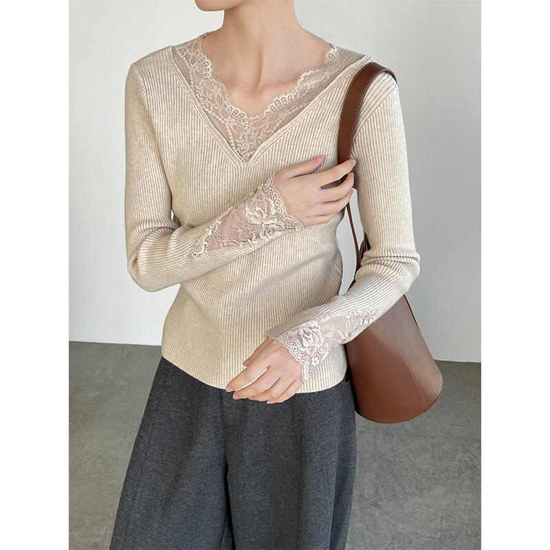 滔川 温柔气质V领蕾丝打底衫25冬韩系显瘦针织上衣YL096