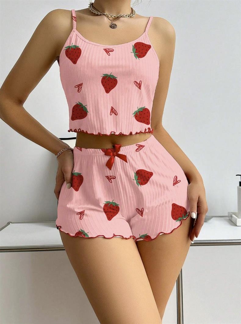 欧美跨境草莓爱心印花坑条套装女士吊带短裤套装两件套甜美可爱