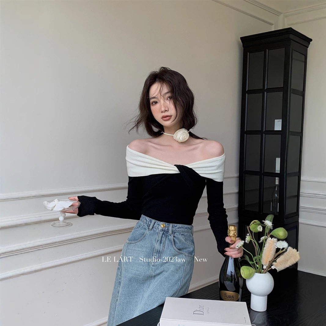 6289 # 秋の新しい韓国版デザイン感が色にぶつかって痩せているニットウェアの小衆純欲一字肩上着の女性