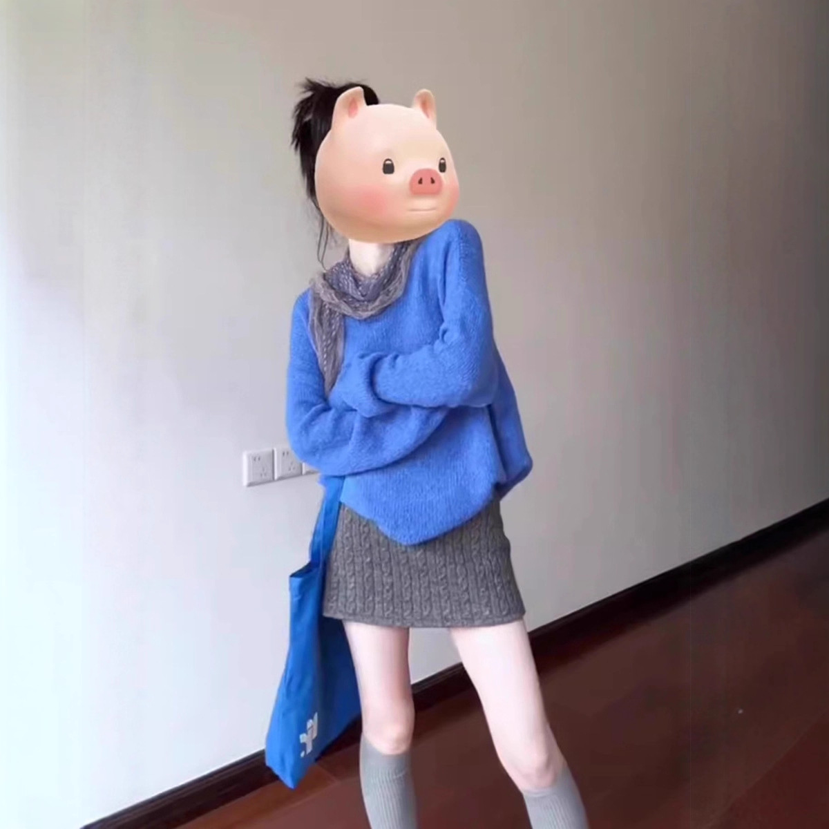 韩系宽松套头蓝色毛衣女秋冬斜肩针织衫上衣+麻花针织短裙女套装