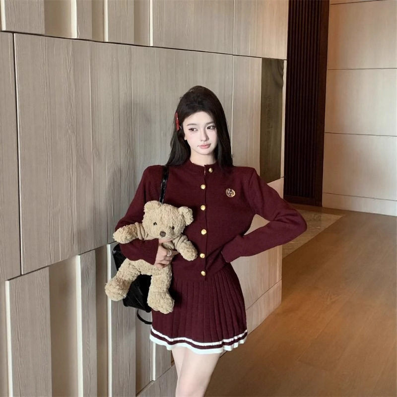 学院风套装甜美红色长袖毛衣针织开衫女入秋穿搭百褶半身裙两件套