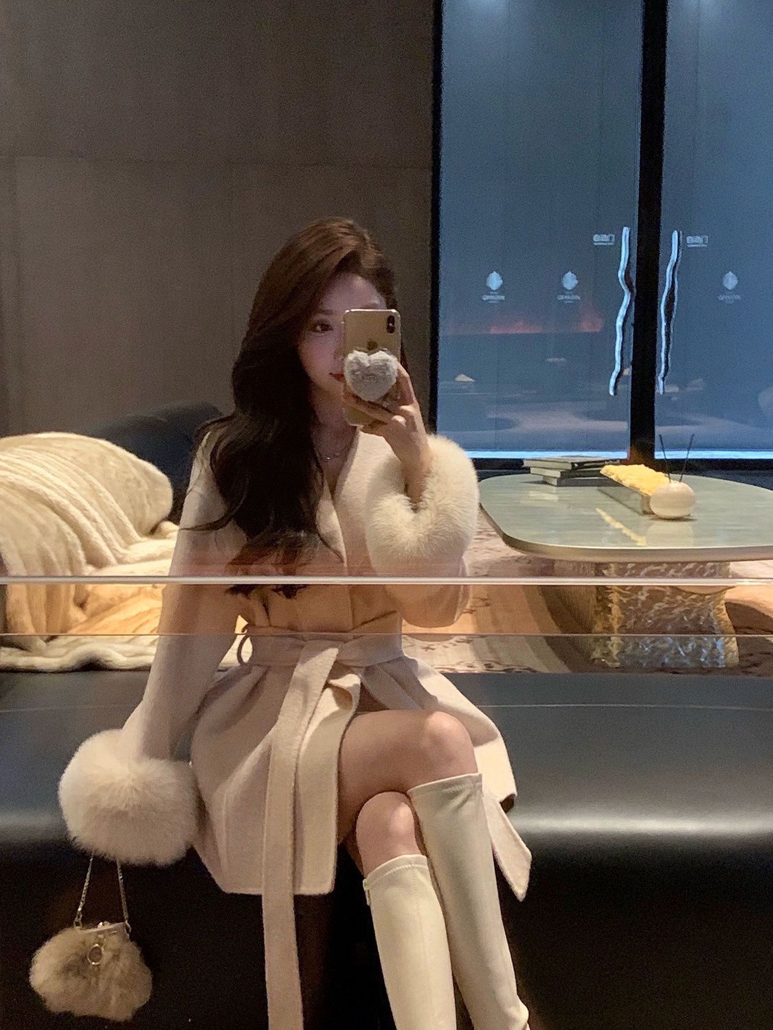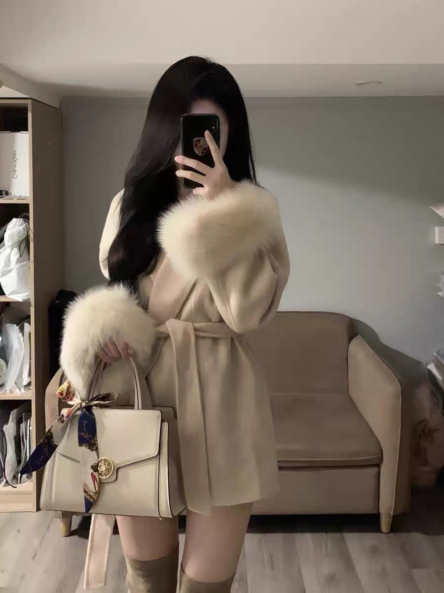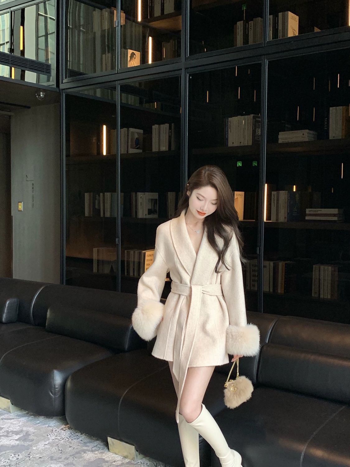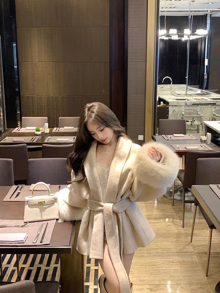 杏色毛毛袖外套女秋冬季收腰秋季系带毛呢外套短款高级感宽松大衣