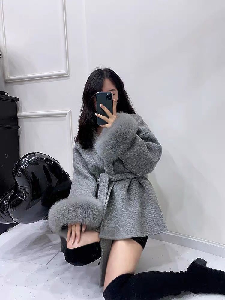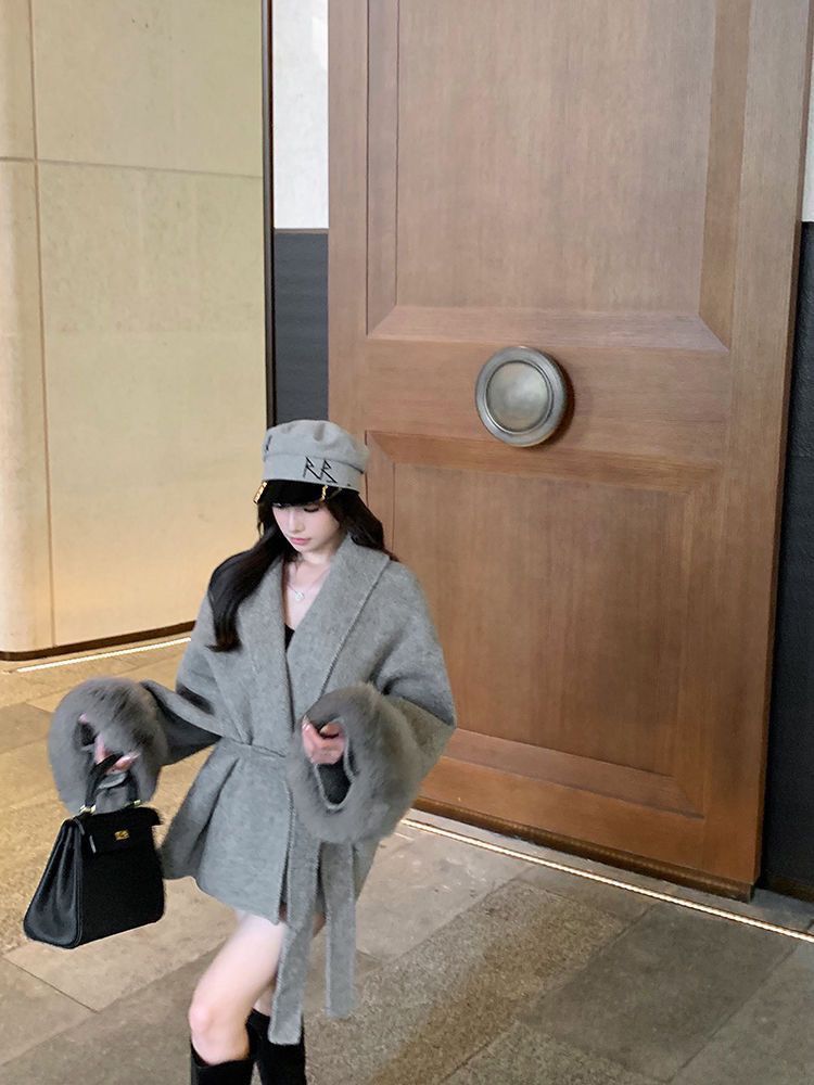 外贸款毛毛袖外套收腰秋季系带毛呢外套短款高级感宽松大衣女灰色