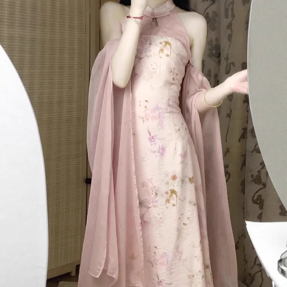 新しい中国風の改良されたチャイナドレス女性の夏の2025新しいニッチ中国風ピンクホルターネックノースリーブドレス
