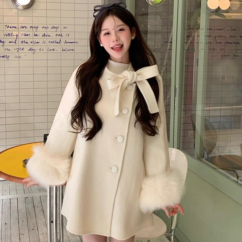 富家千金风法式复古斗篷大衣蝴蝶结白色加厚毛呢保暖外套秋冬季女