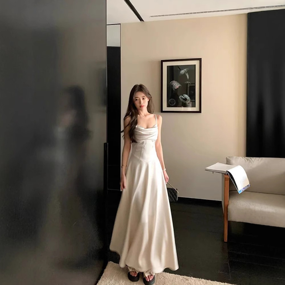 フレンチスタイルのスリムフィットホルターネックドレス女性のための2025夏の新しいウエストリゾートスタイルノースリーブロングスカート
