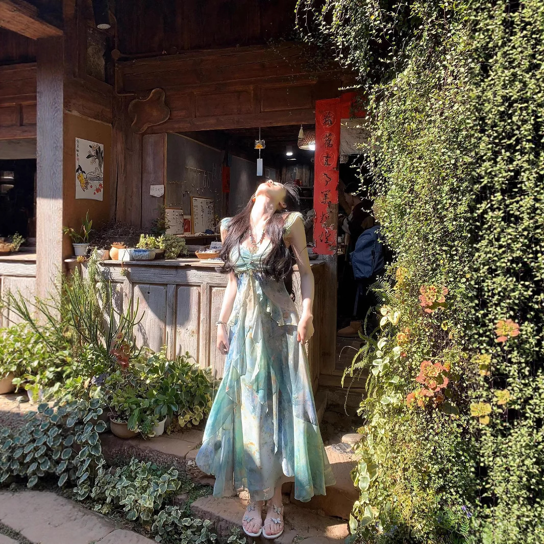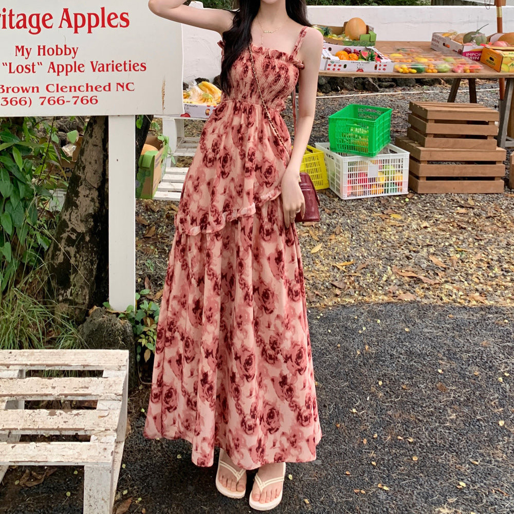 夏デザイン海辺リゾートスタイルプリント妖精スカート婦人服 2025 新しいウエスト痩身サスペンダードレス