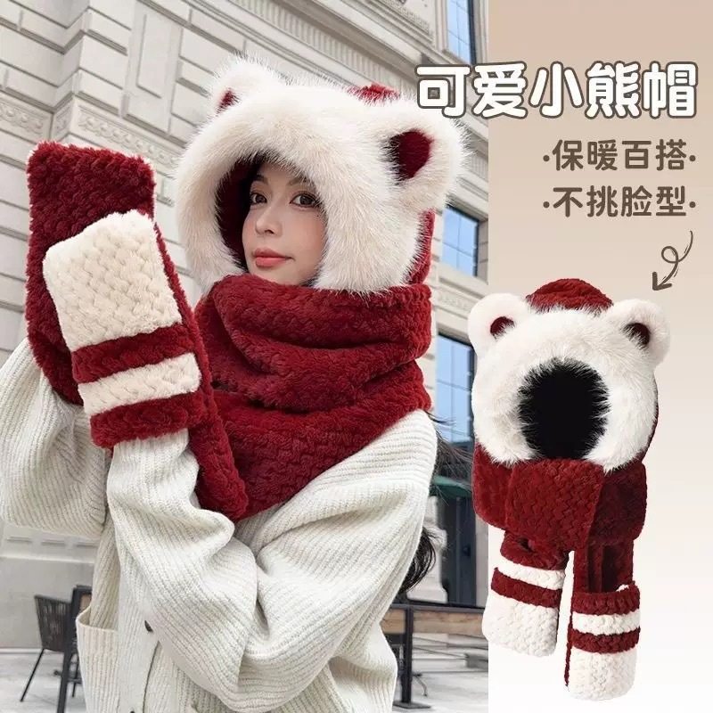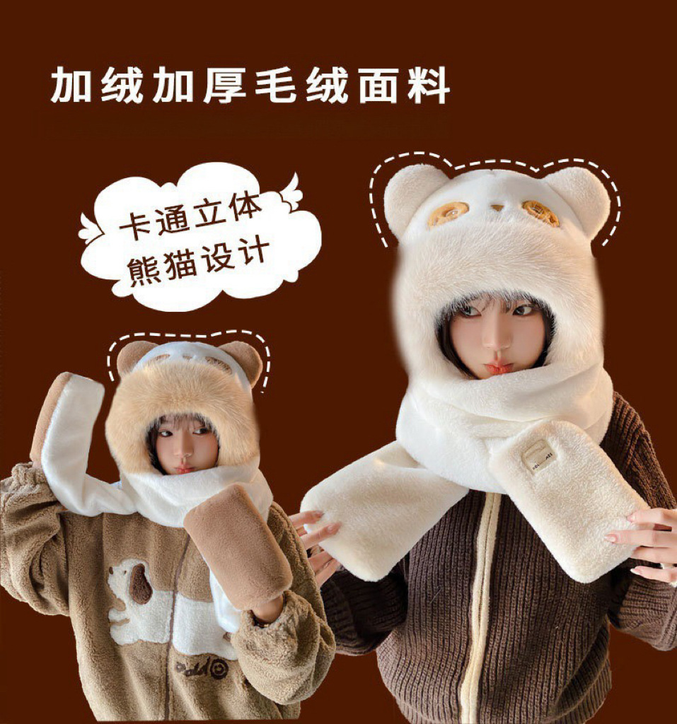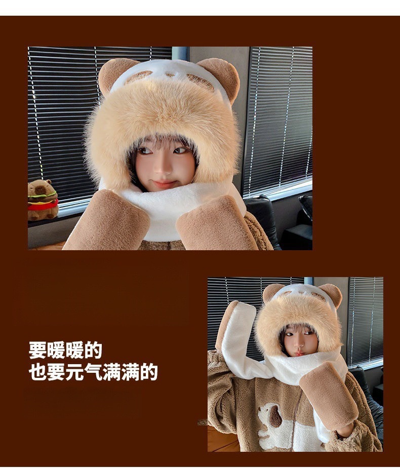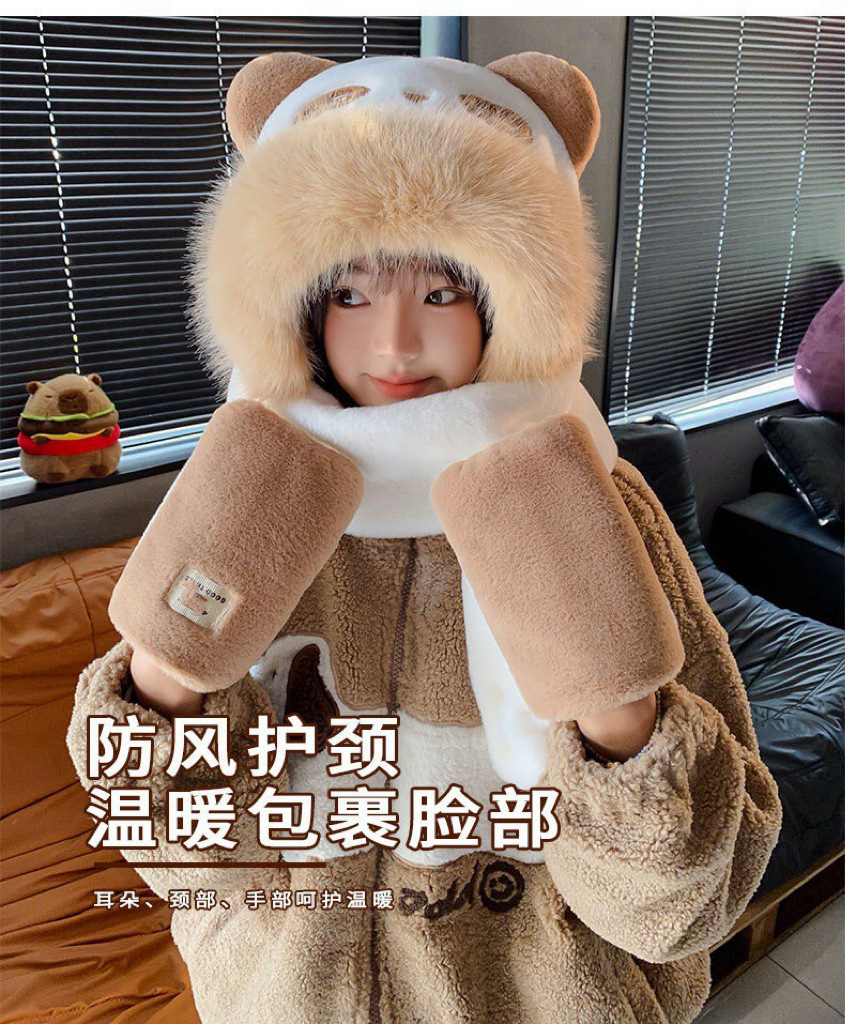 可爱小熊耳朵帽子围巾手套一体防寒保暖女秋冬加厚毛绒护耳骑车帽