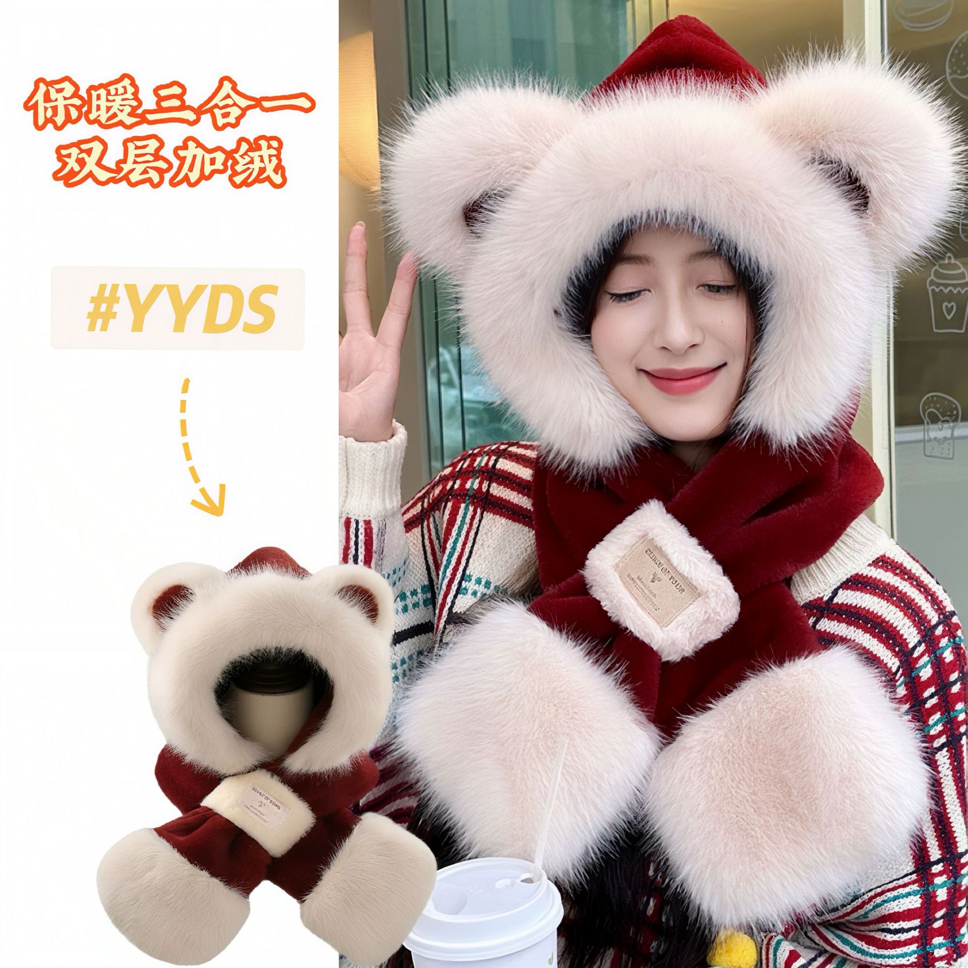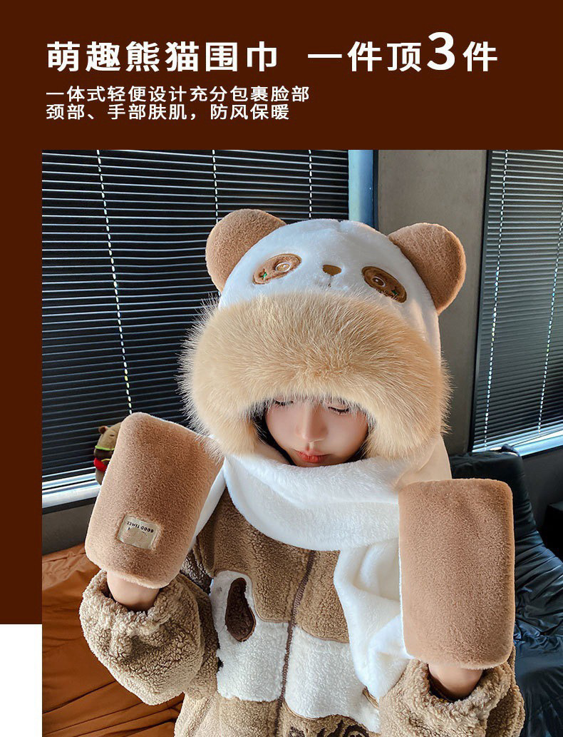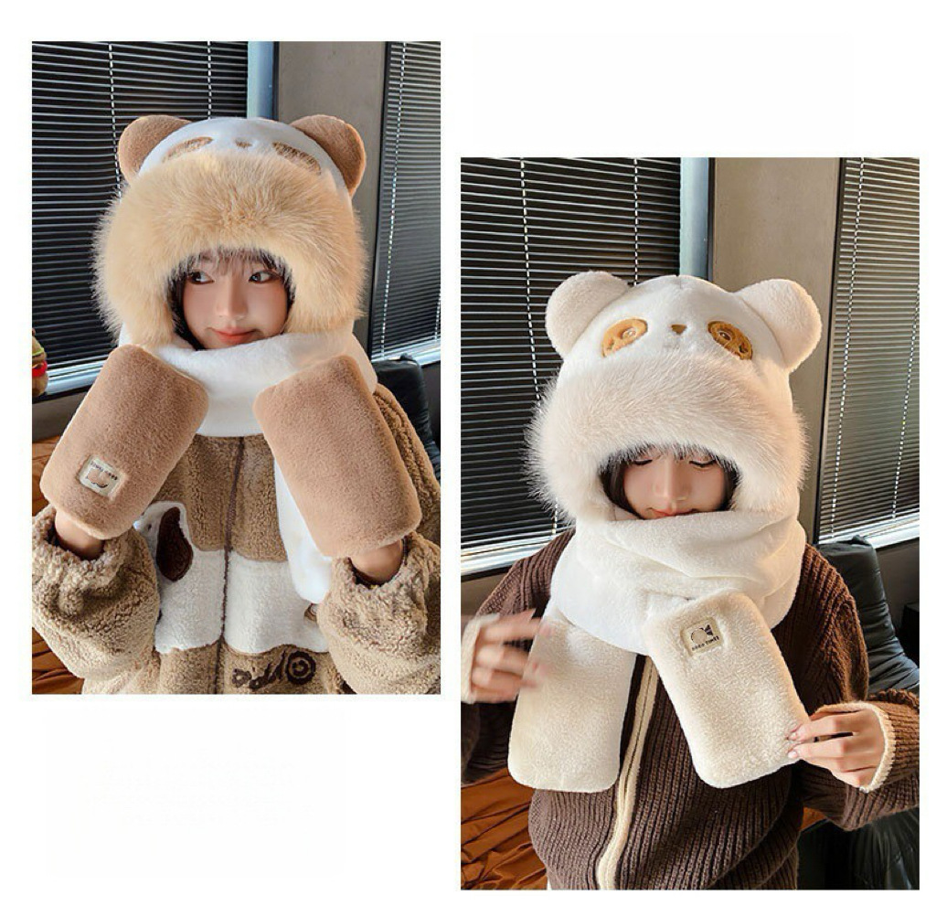 可爱小熊耳朵帽子围巾手套一体防寒保暖女秋冬加厚毛绒护耳骑车帽
