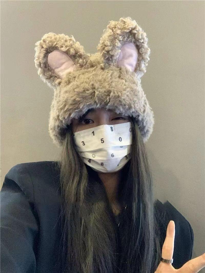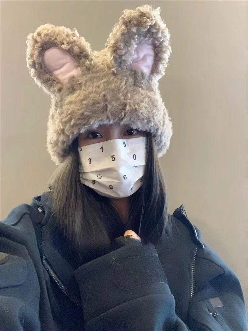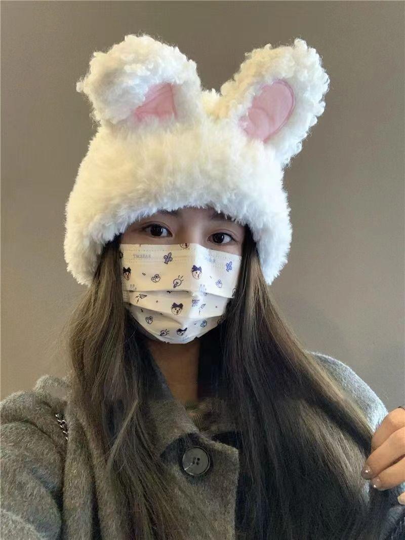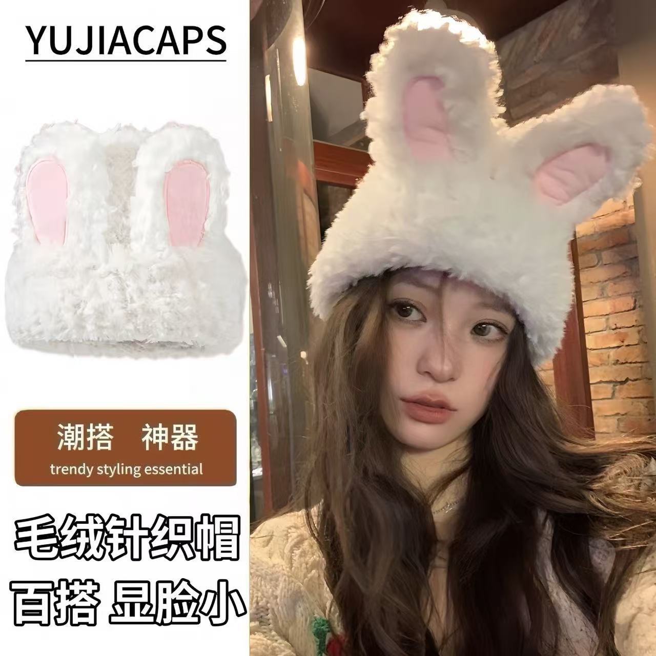 韩国可爱毛绒兔耳朵帽子女秋冬保暖针织帽护耳显脸小冷帽包头帽潮