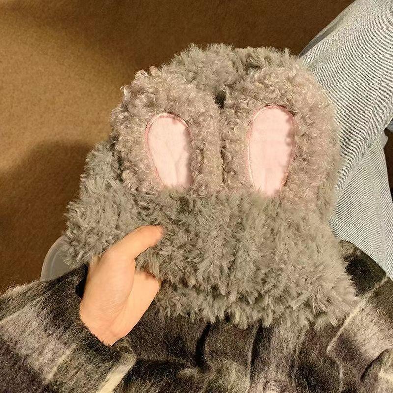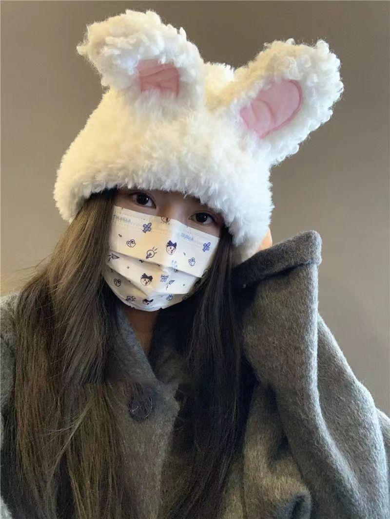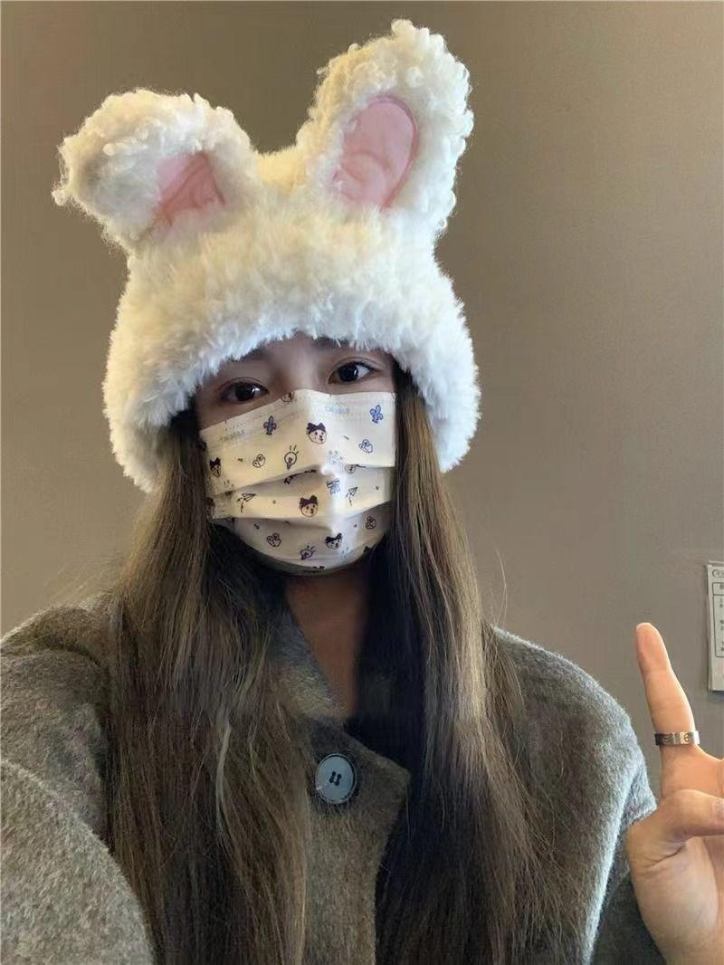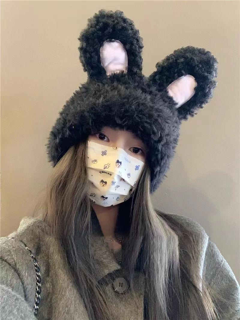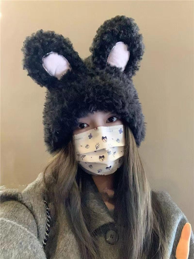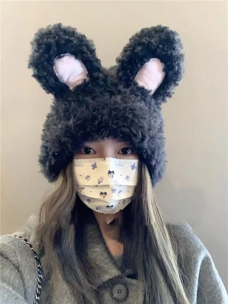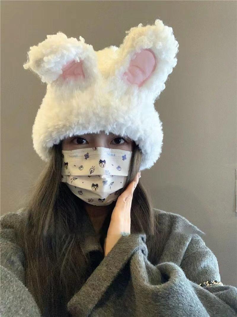 日系可爱毛绒兔耳朵帽子女秋冬季保暖针织帽护耳套头显脸小针织帽