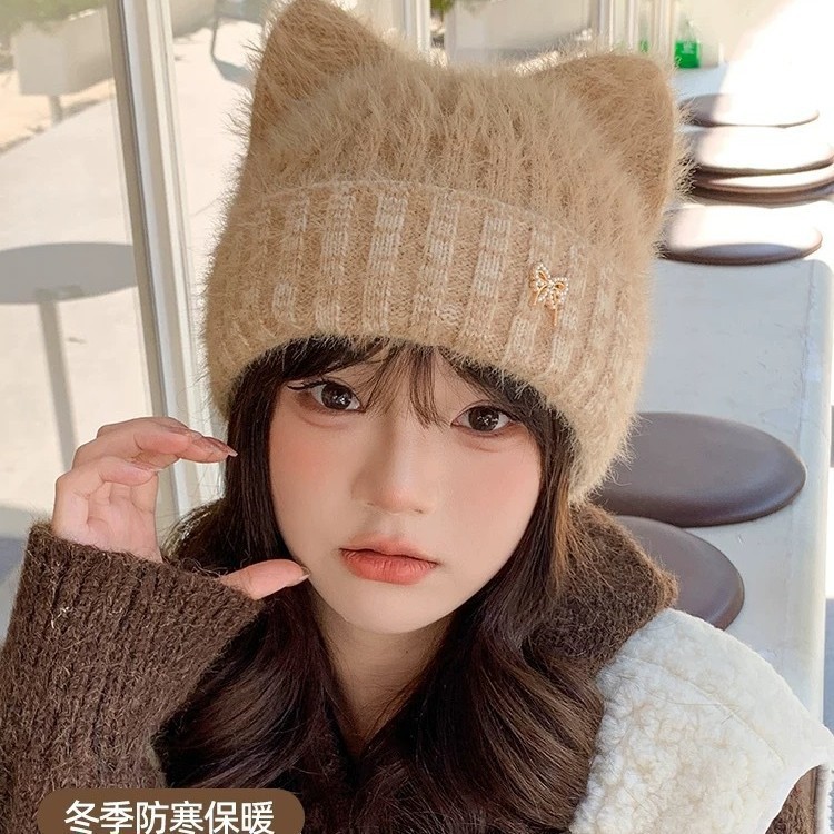 2025新款可爱甜美蝴蝶结小标帽子女冬季保暖防风护耳针织毛线帽