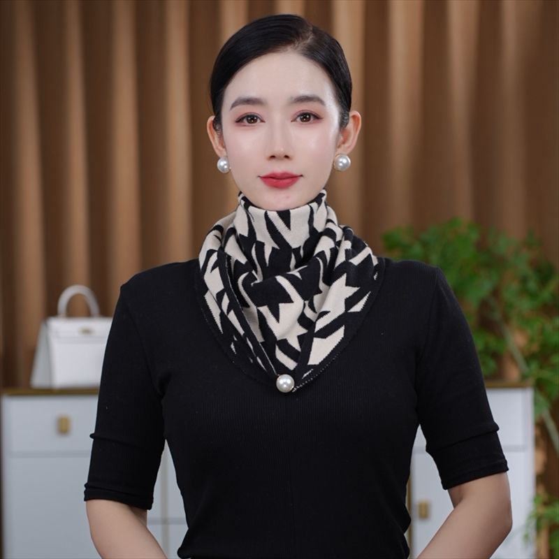 ファッション気質秋冬新作韓国版百合ニット保温色合わせ真珠磁気ボタン三角タオル保温マフラー