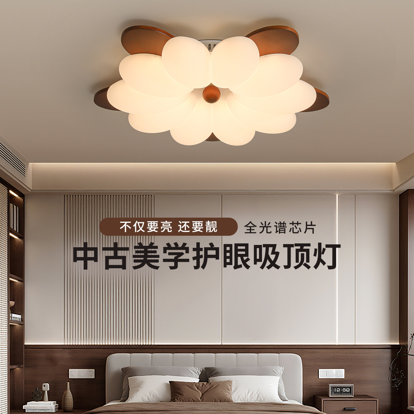 法式中古风卧室吸顶灯复古实木灯花朵主卧儿童房护眼中山灯具L335
