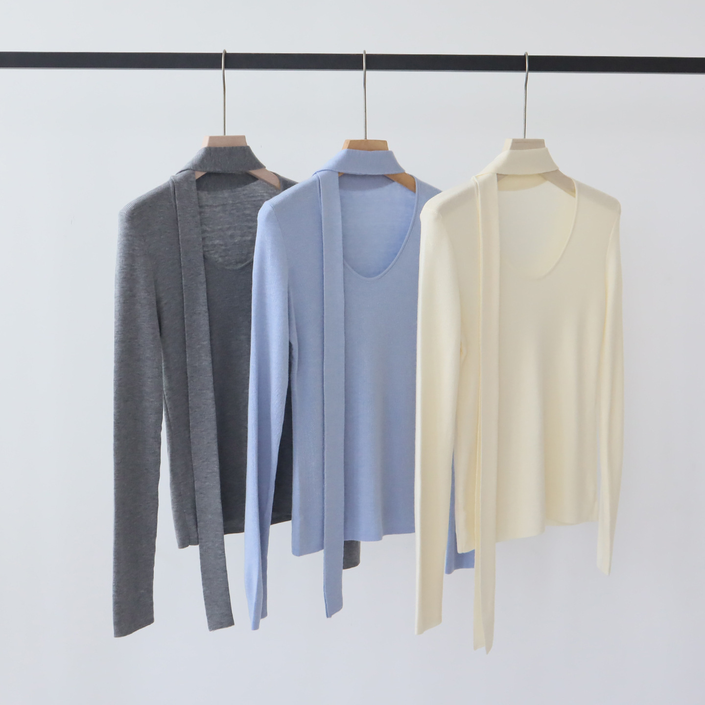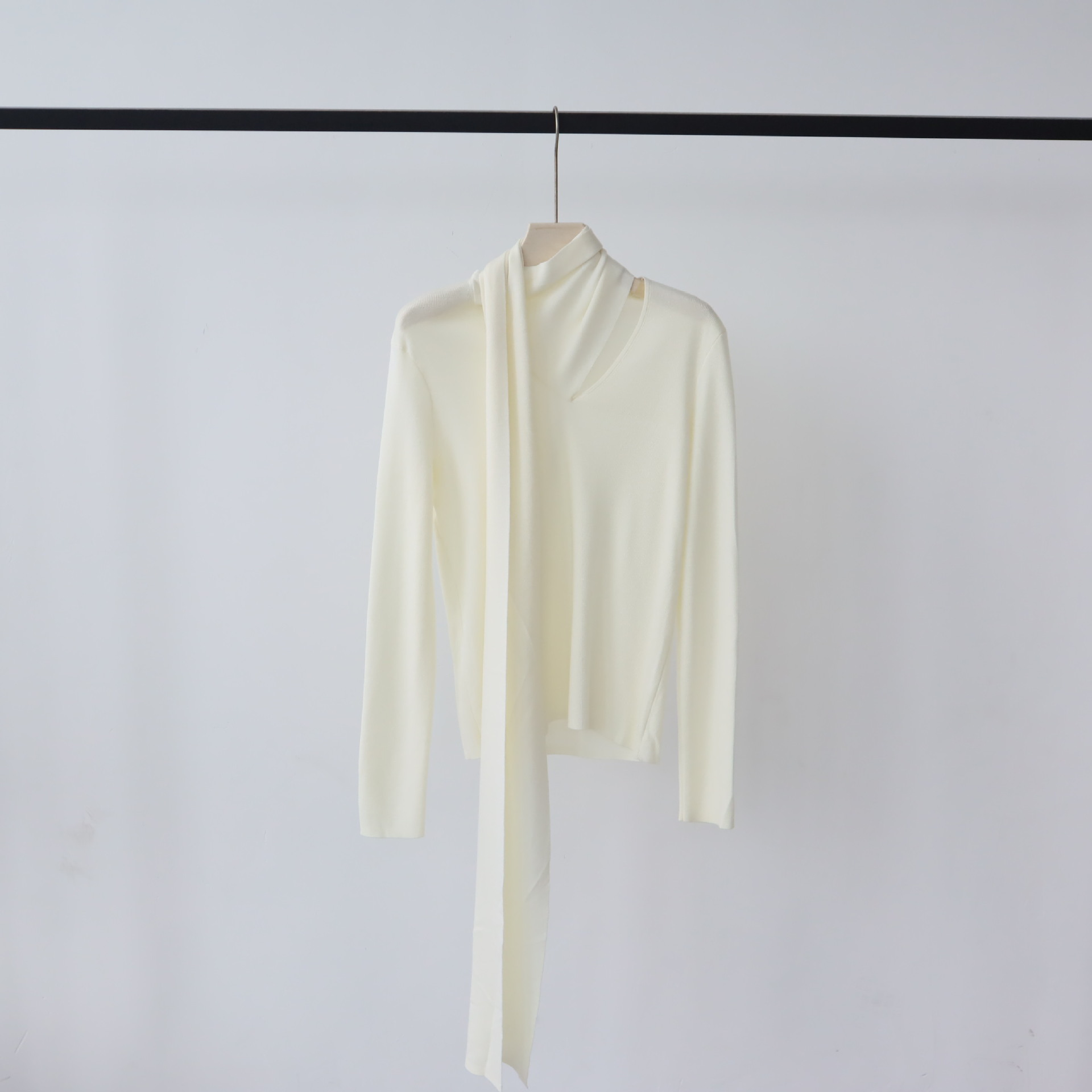 十三行女装早秋穿搭高级感羊毛混纺针织衫设计感飘带围巾领上衣女