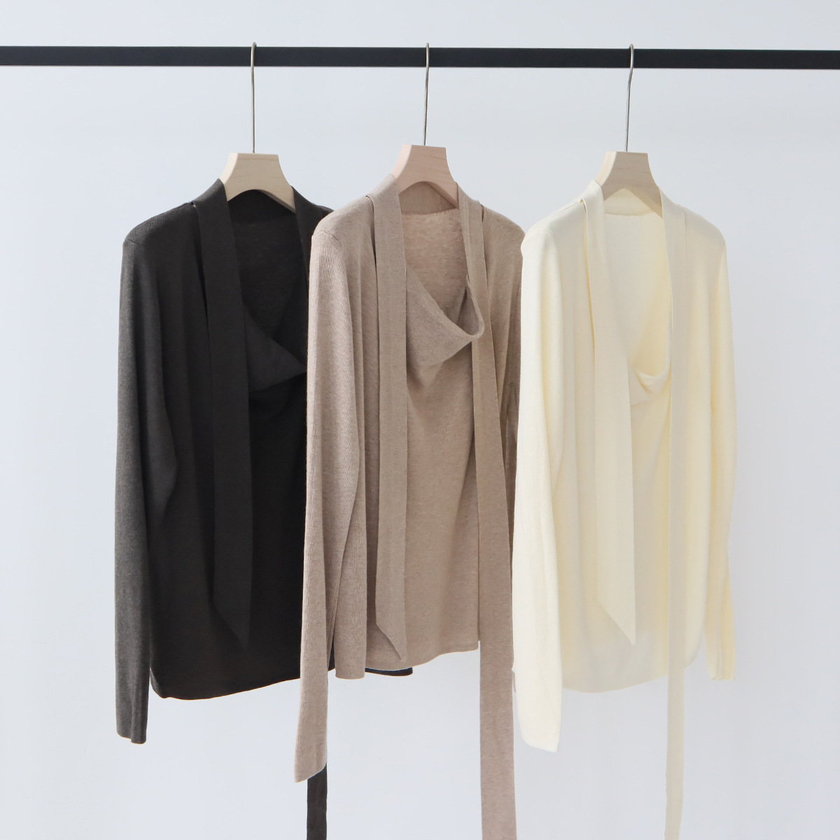 十三行早秋穿搭羊毛混纺针织衫长袖外搭设计感带飘带上衣女打底衫