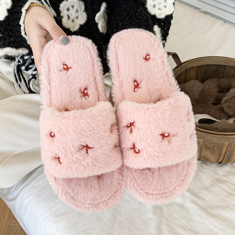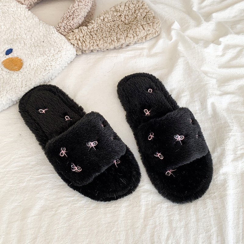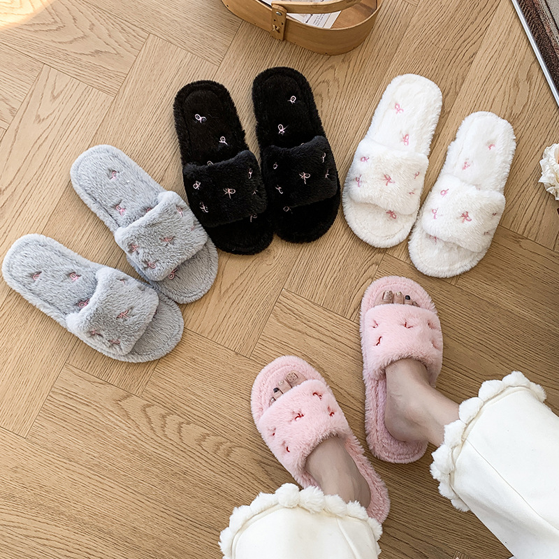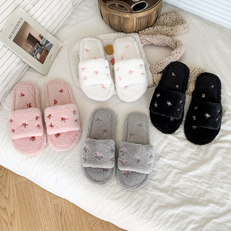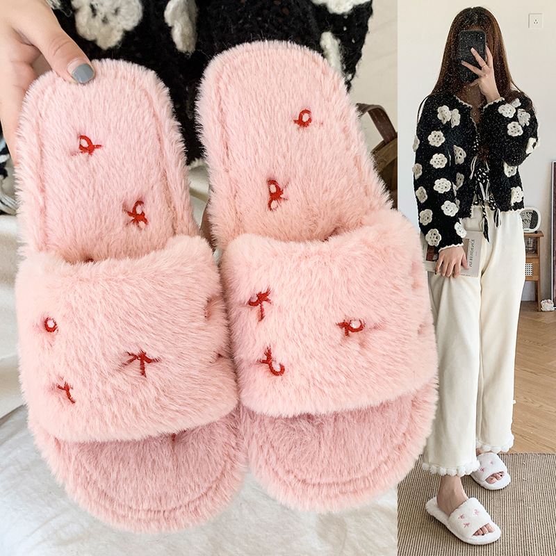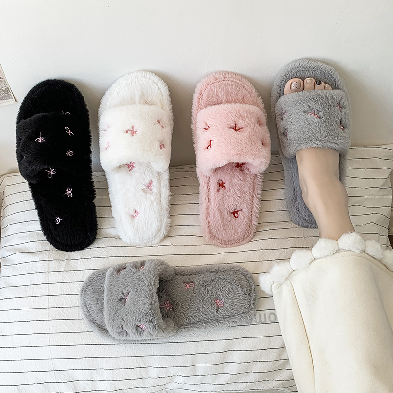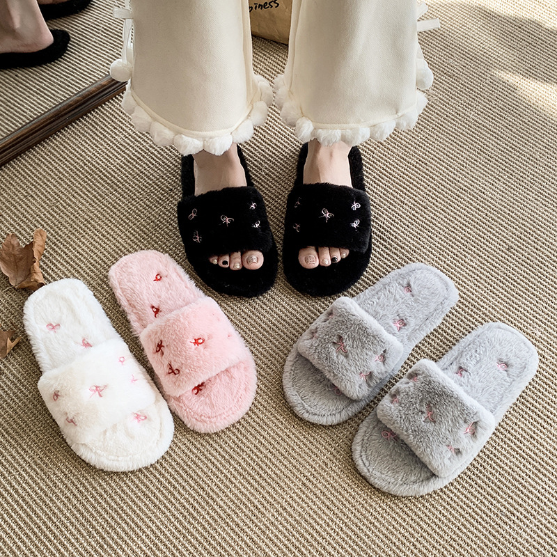 跨境亚马逊秋冬新款居家室内软底毛毛拖鞋女时尚蝴蝶结刺绣棉拖鞋