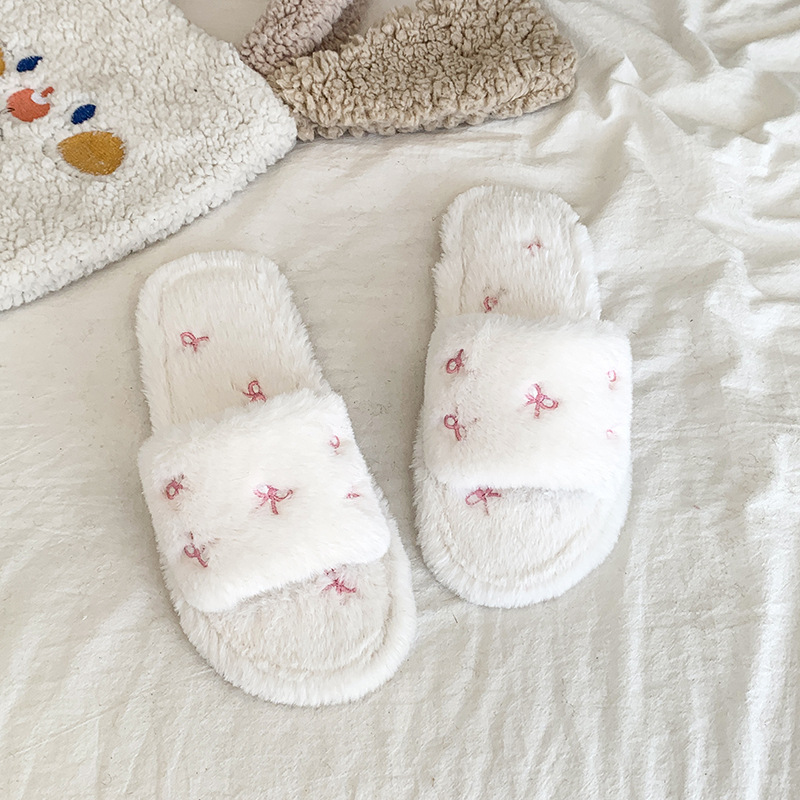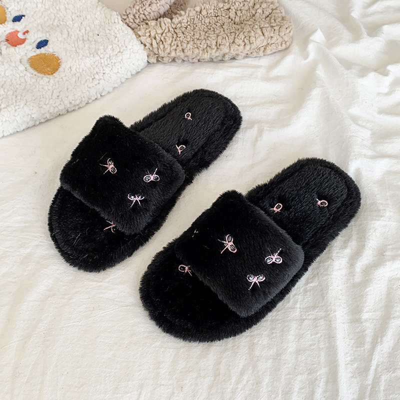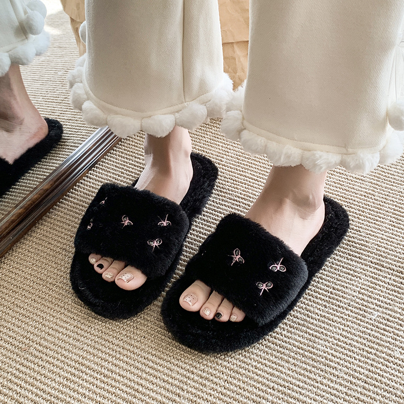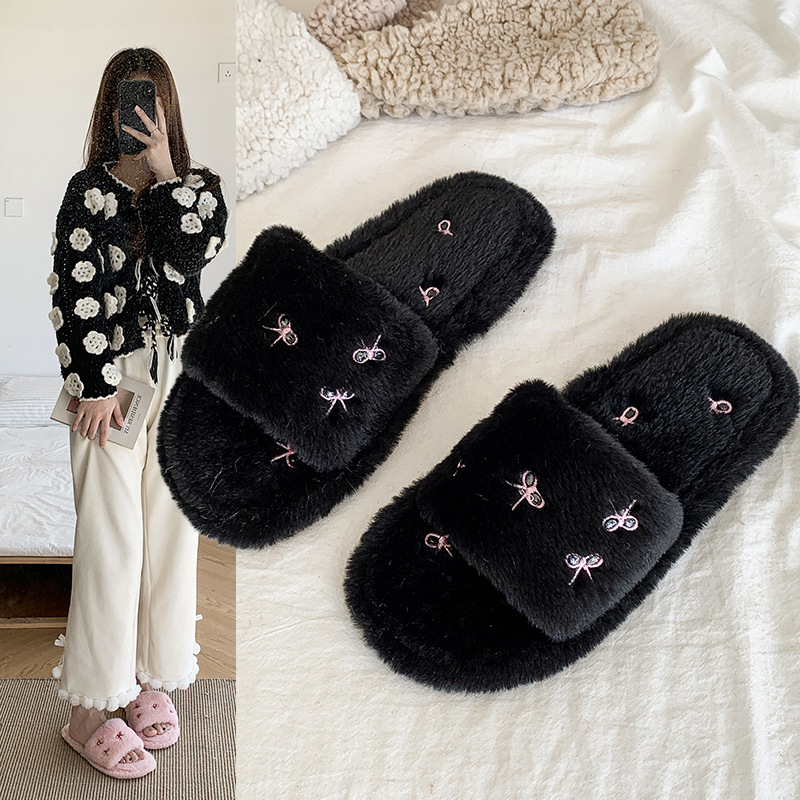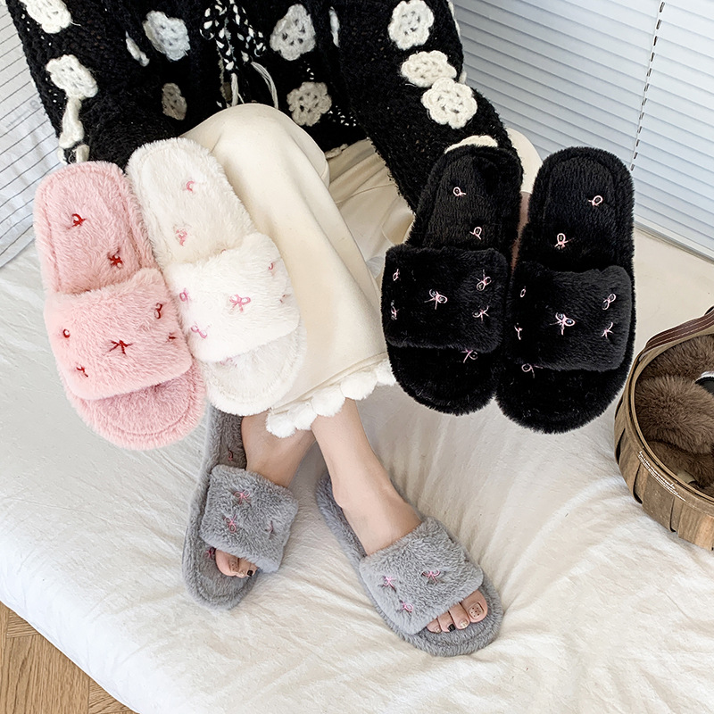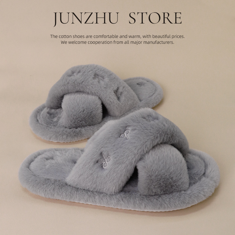 跨境亚马逊秋冬新款居家室内软底毛毛拖鞋女时尚蝴蝶结刺绣棉拖鞋