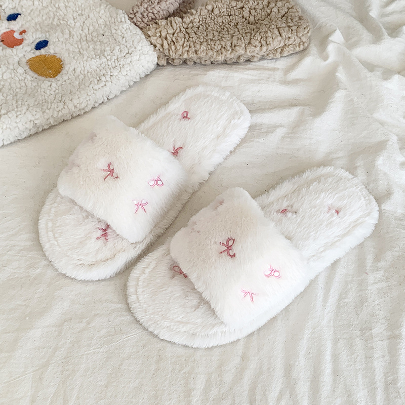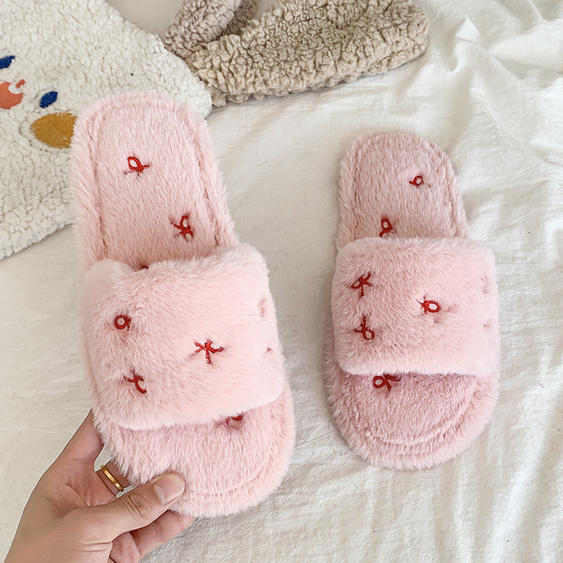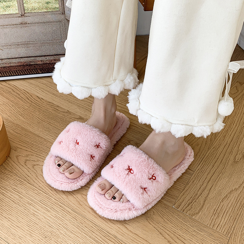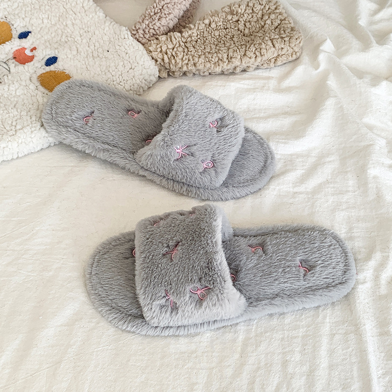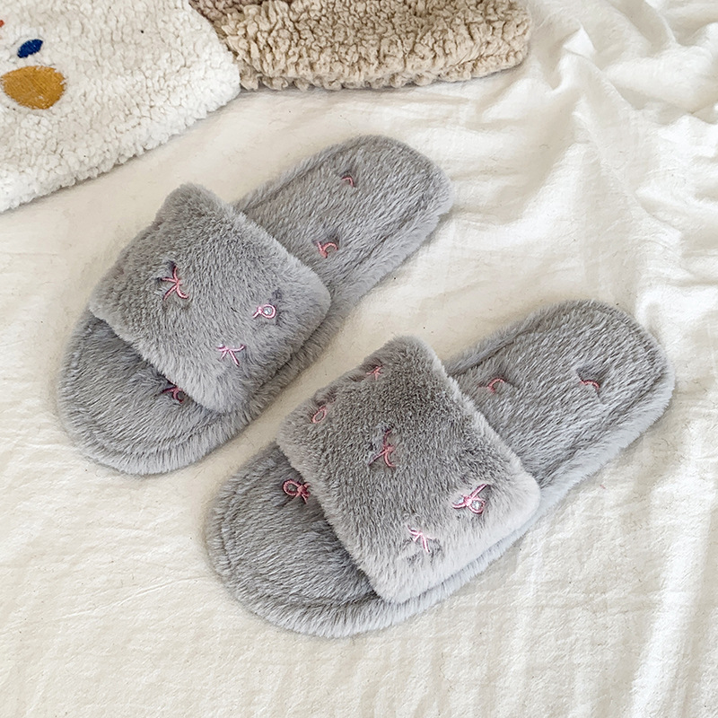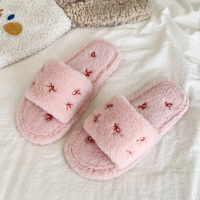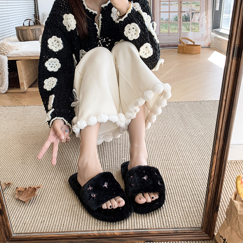跨境亚马逊秋冬新款居家室内软底毛毛拖鞋女时尚蝴蝶结刺绣棉拖鞋