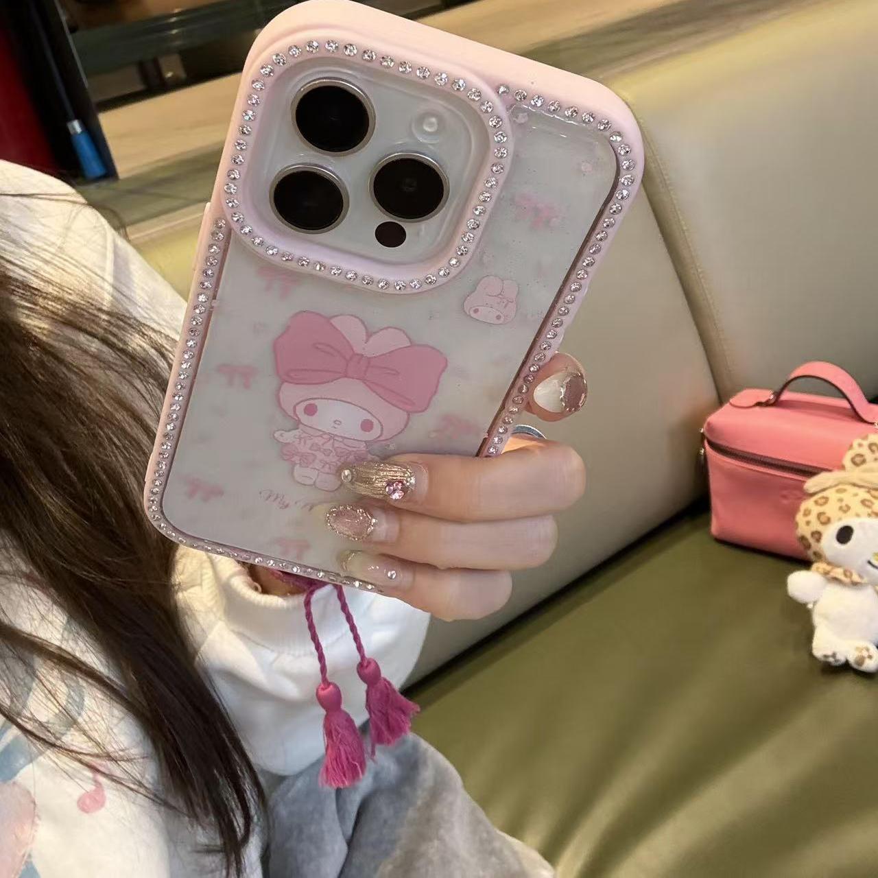 韓国インスタイルの漫画のかわいいボーダー、ダイヤモンドメロディーリボン付き、iPhone16promaxに最適