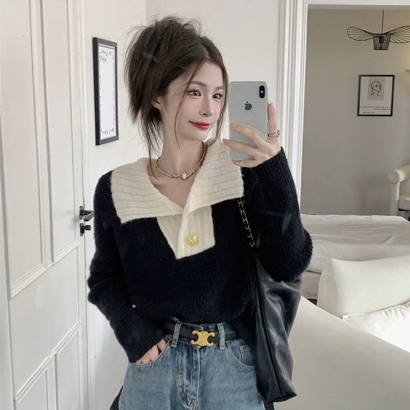 新しい秋冬のニットの小さい大衆のフランスの感じのゆったりしている上着は襟をひっくり返して色の怠惰な風にぶつかってセーターの婦人服に入ります。